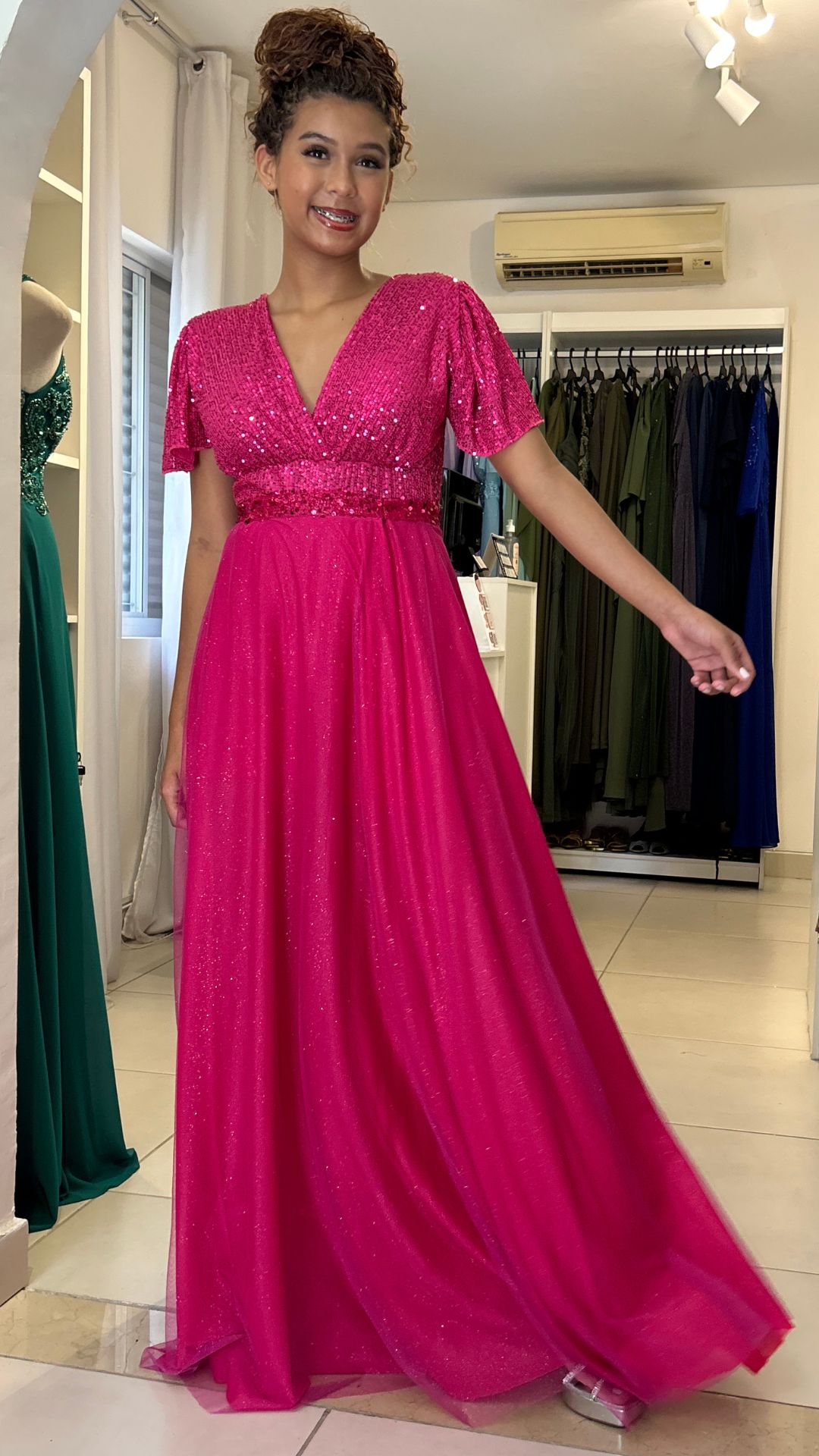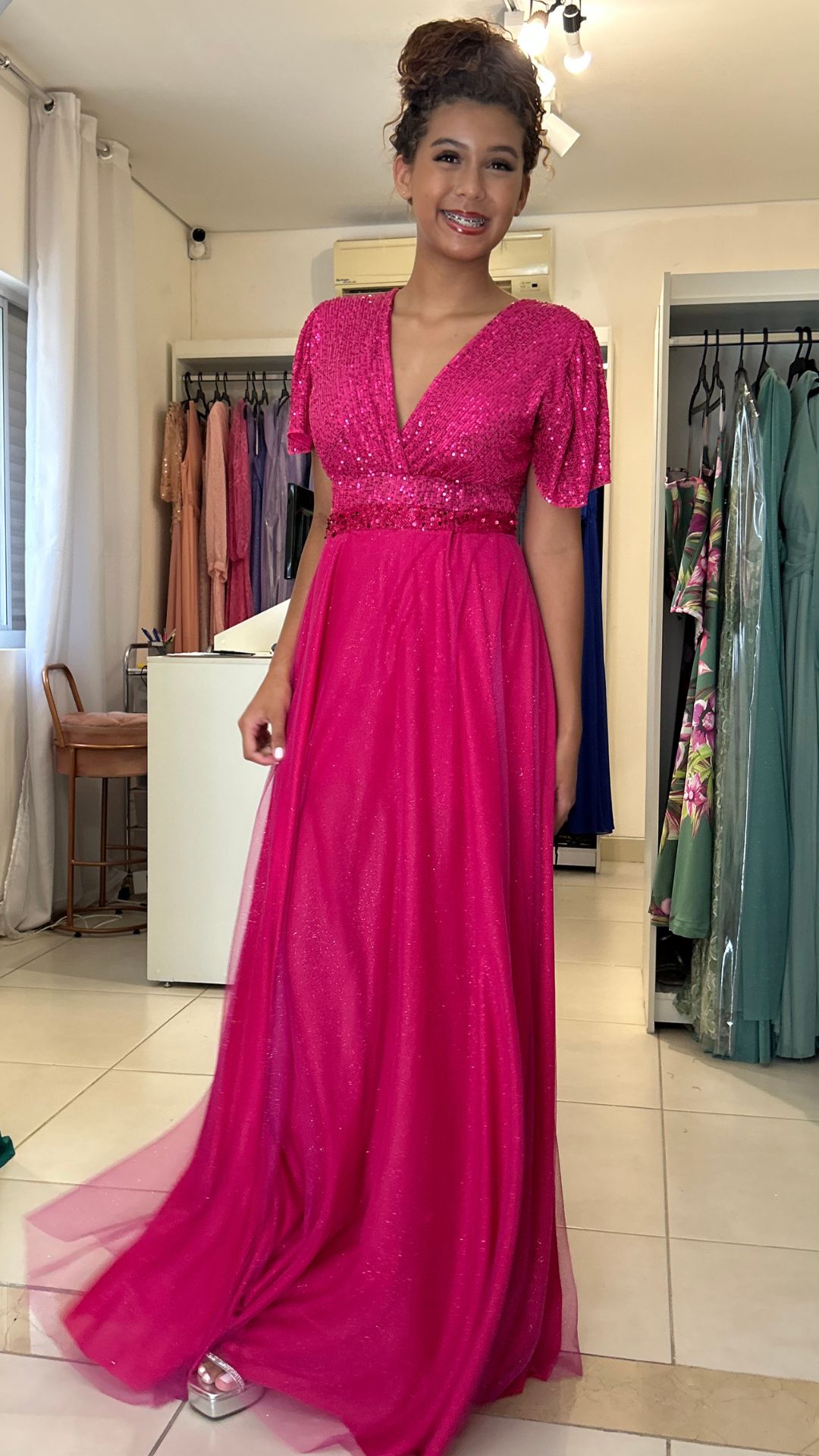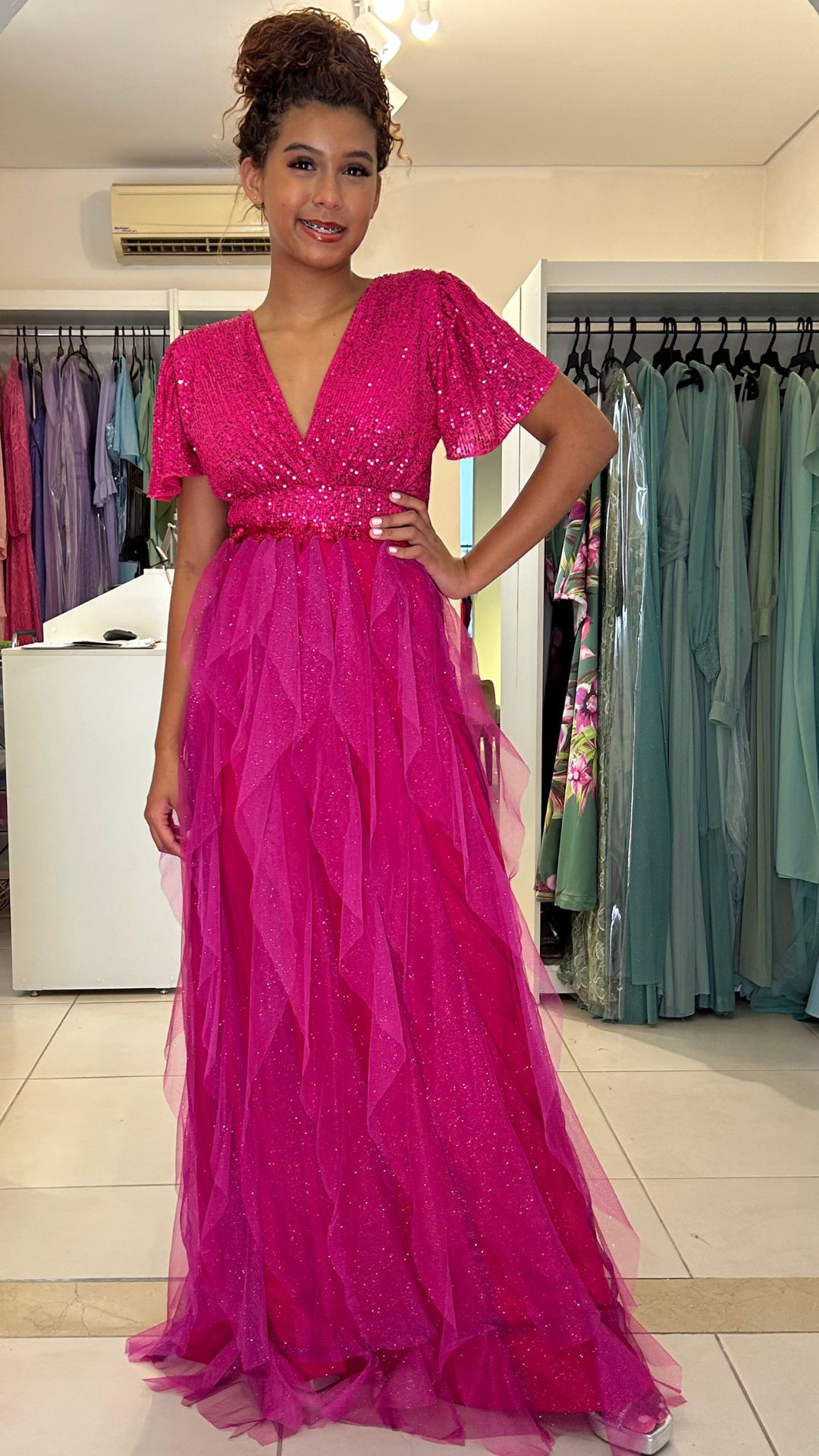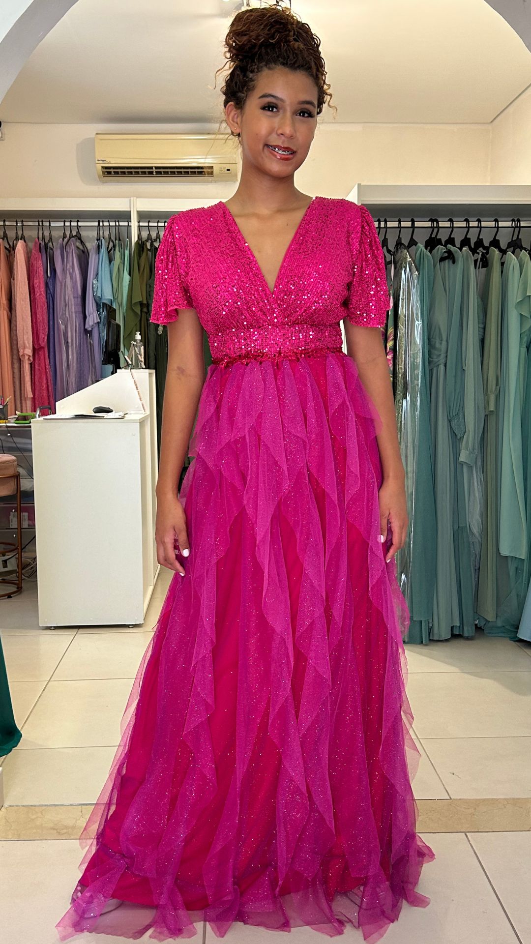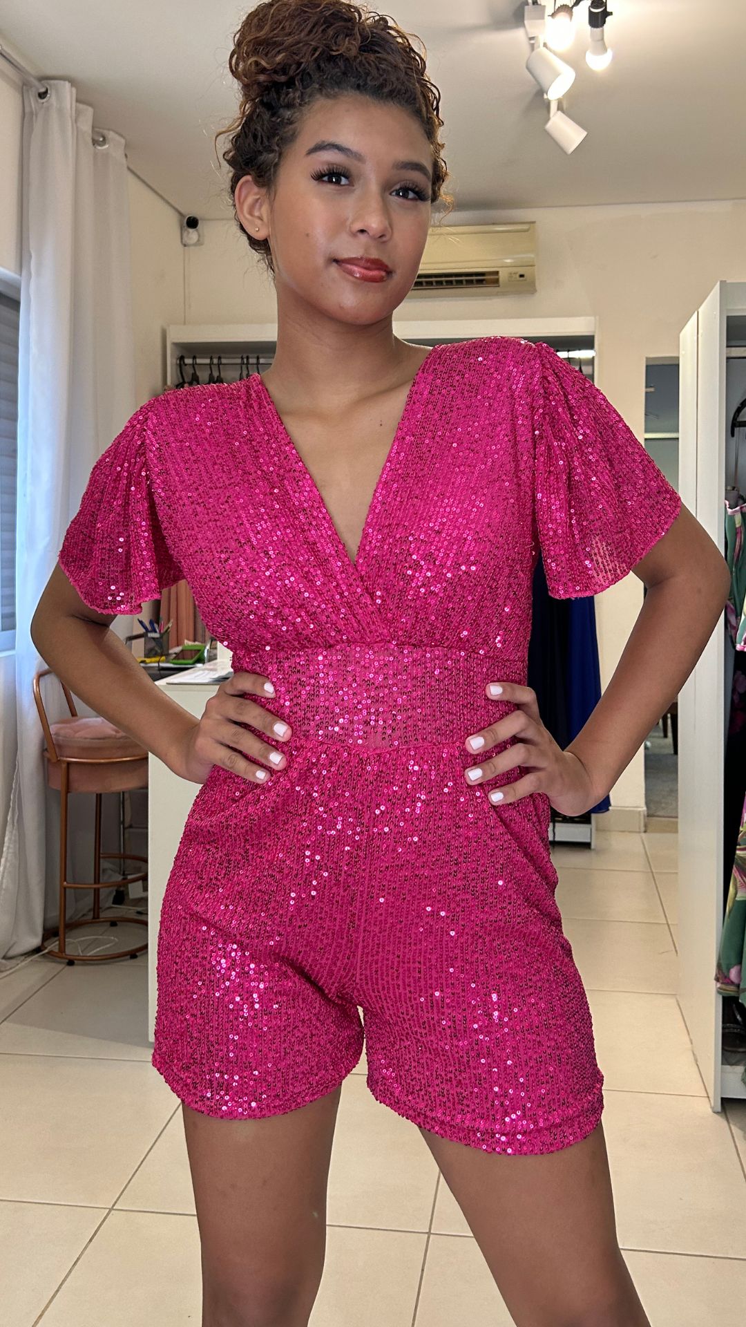 Macacão curto com modelagem justa e moderna, confeccionado em tecido rosa pink totalmente coberto por paetês, ideal para quem busca um visual jovem e ousado. O decote alto estilo halter valoriza os ombros e o colo, proporcionando sofisticação. A peça acompanha uma saia longa em tule com brilho removível, que adiciona movimento e elegância ao look, permitindo duas formas de uso: curto e descontraído ou longo e glamouroso. Uma escolha versátil para aniversariantes, debutantes e fashionistas que desejam transformar o visual com um único look.