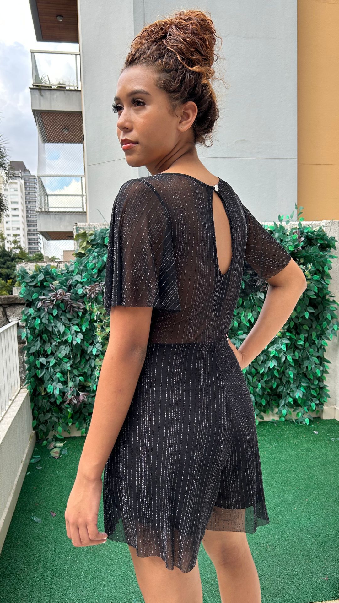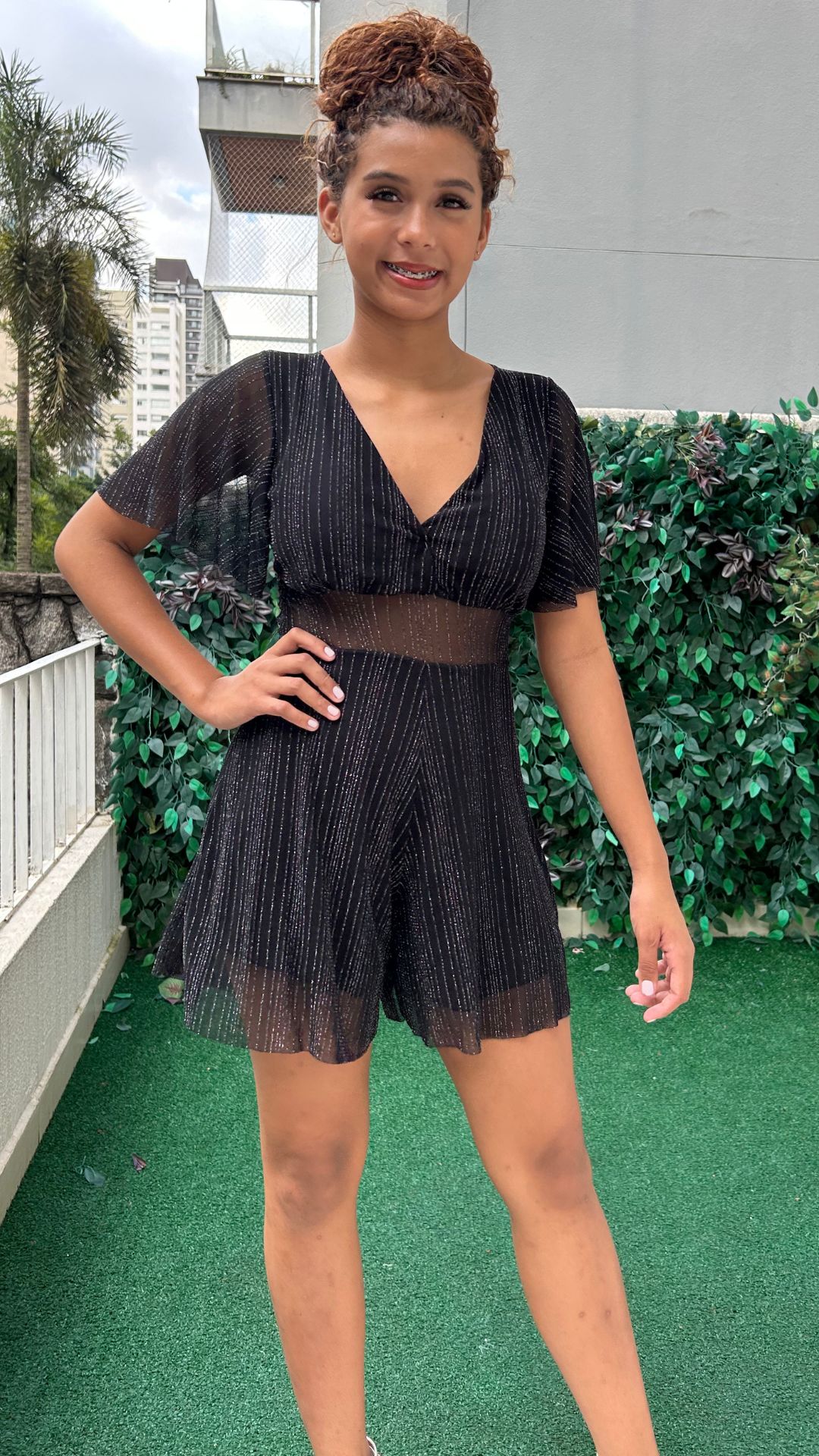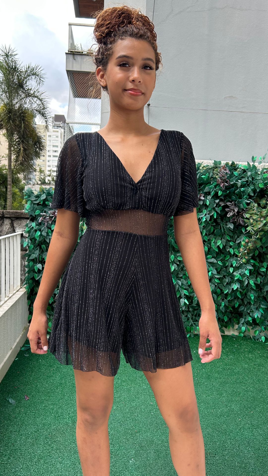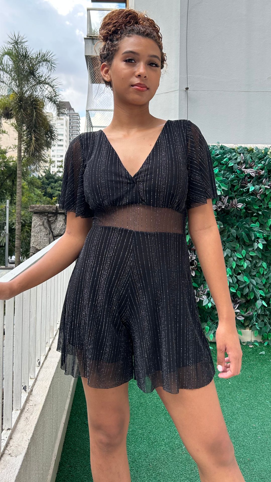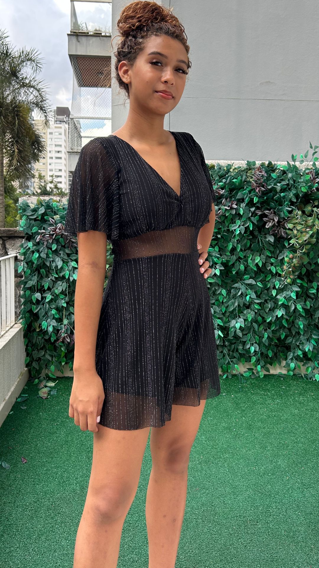 Macacão curto com design moderno e toque sofisticado, confeccionado em tecido preto com delicadas listras verticais em brilho prateado. A peça apresenta decote em V que valoriza o colo, mangas curtas amplas e um elegante recorte na cintura em tule translúcido, criando o efeito de cintura marcada e levemente à mostra. As costas contam com fecho em botão perolado e abertura em formato de gota. O caimento leve e o short soltinho proporcionam conforto e liberdade de movimento, tornando este look ideal para eventos noturnos, festas estilosas e produções fashionistas.