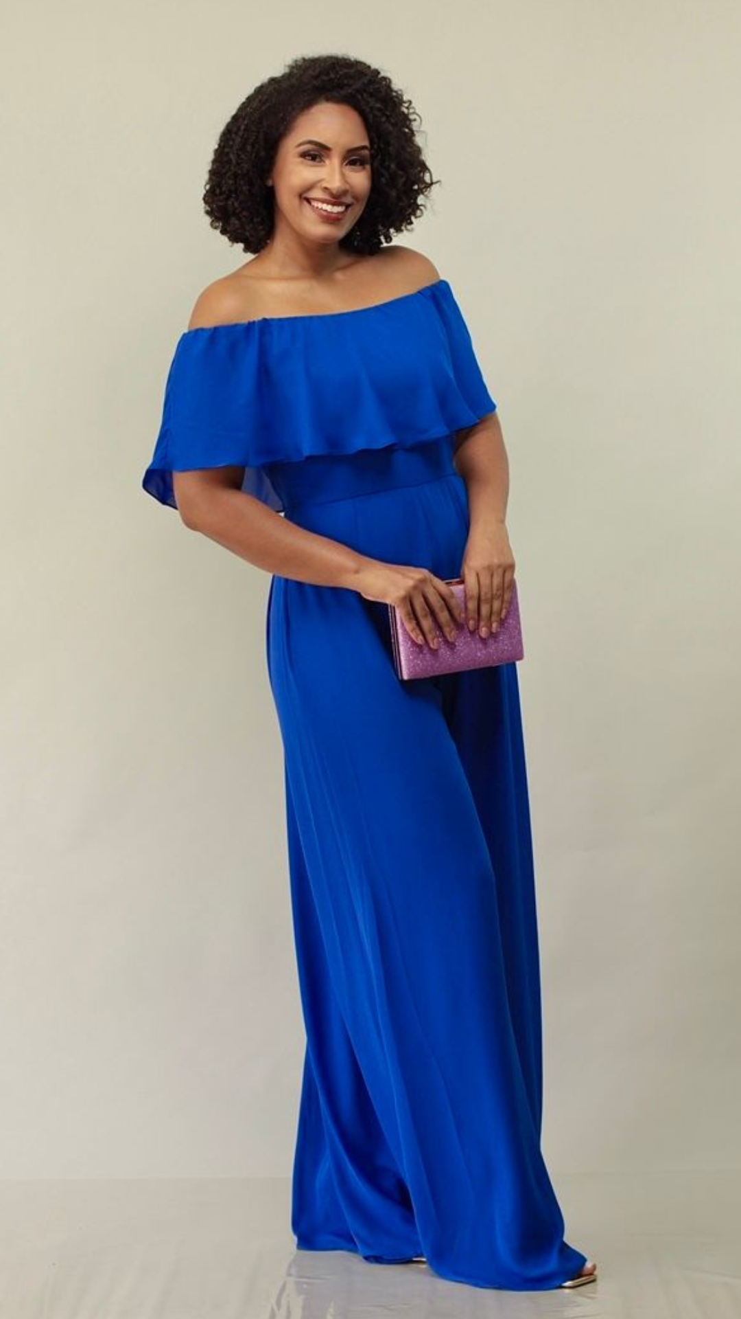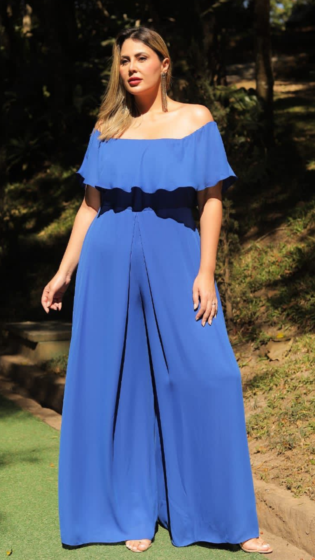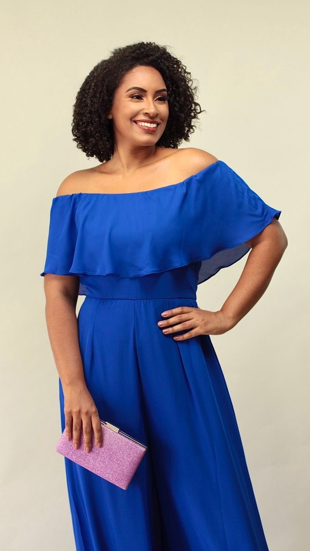 Macacão Ombro a Ombro em Chiffon com Babado – Azul Royal ou Pink | Look Festa Elegante e Confortável