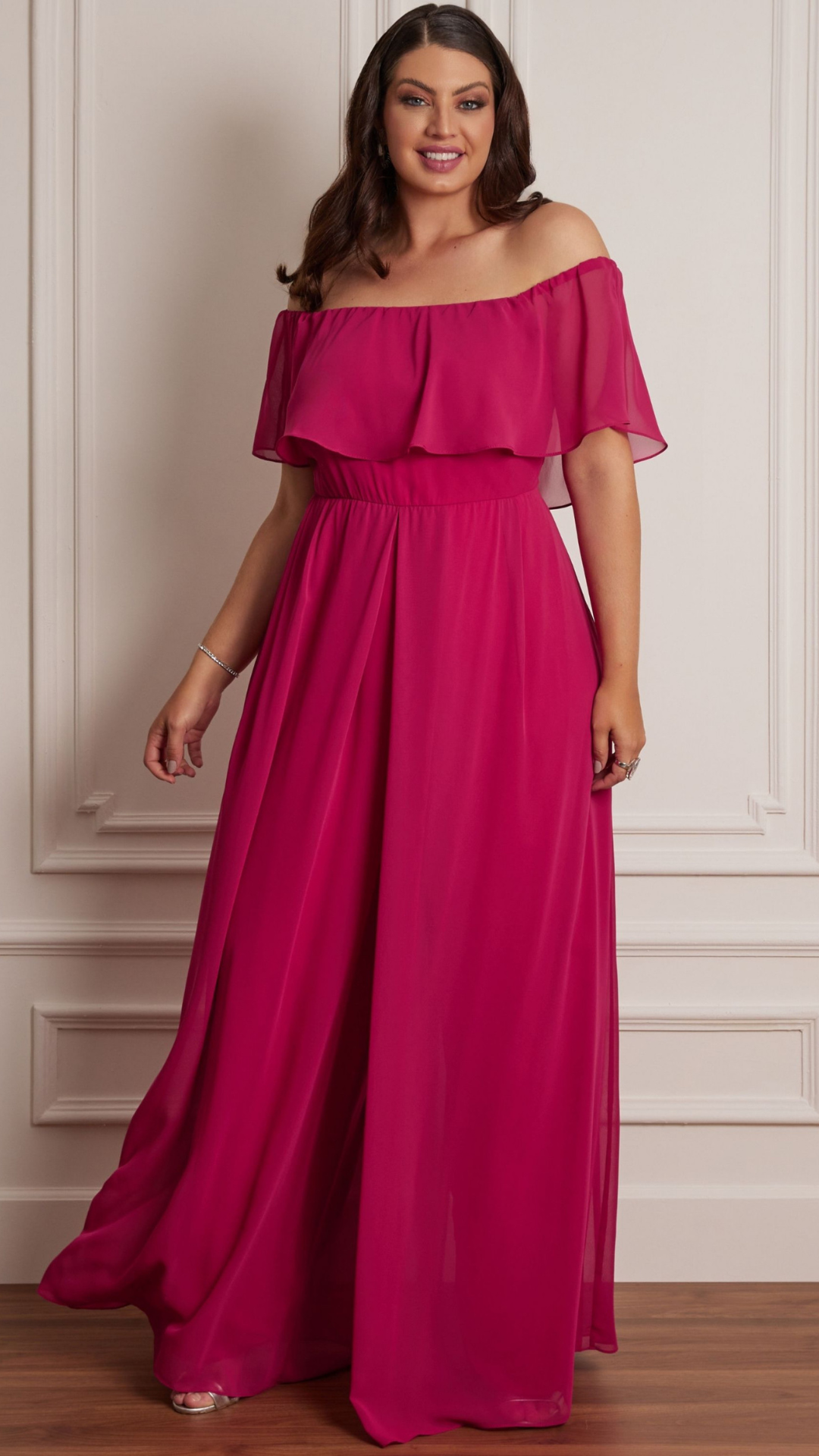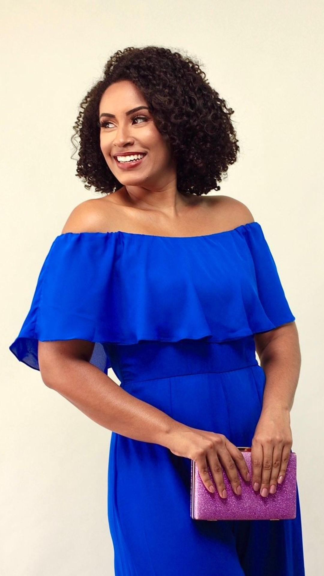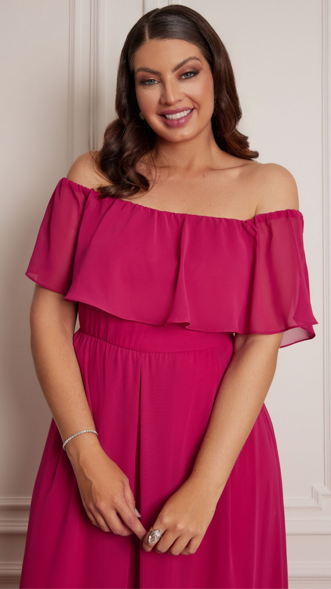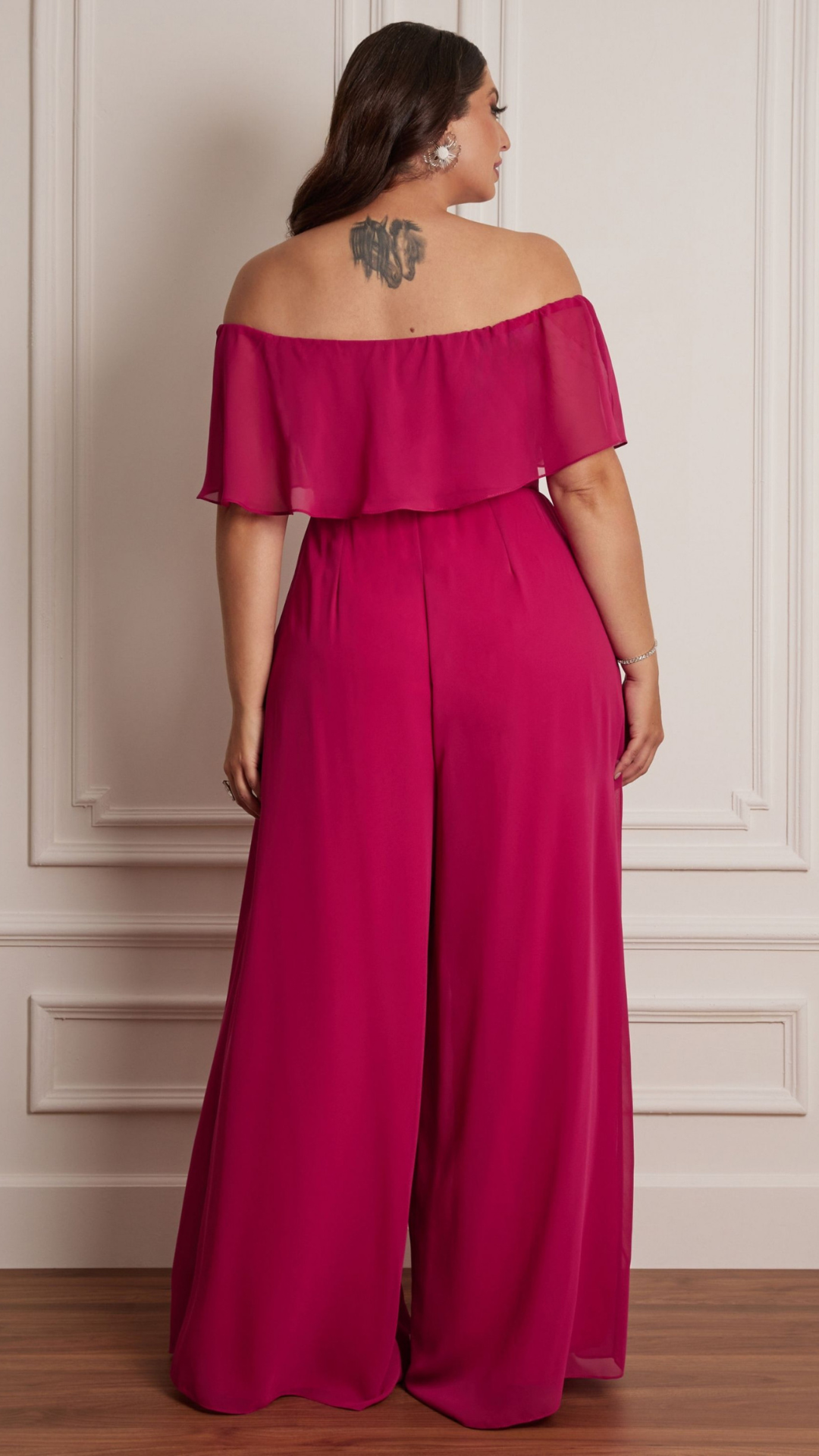 Macacão Ombro a Ombro em Chiffon com Babado – Azul Royal ou Pink | Look Festa Elegante e Confortável