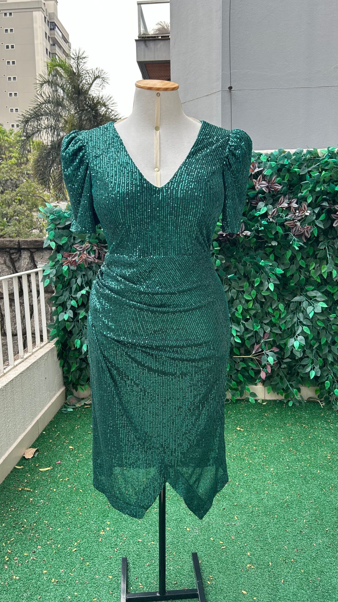 Vestido curto confeccionado em tecido bordado com paetês verde esmeralda, que reflete a luz de forma elegante e luxuosa.