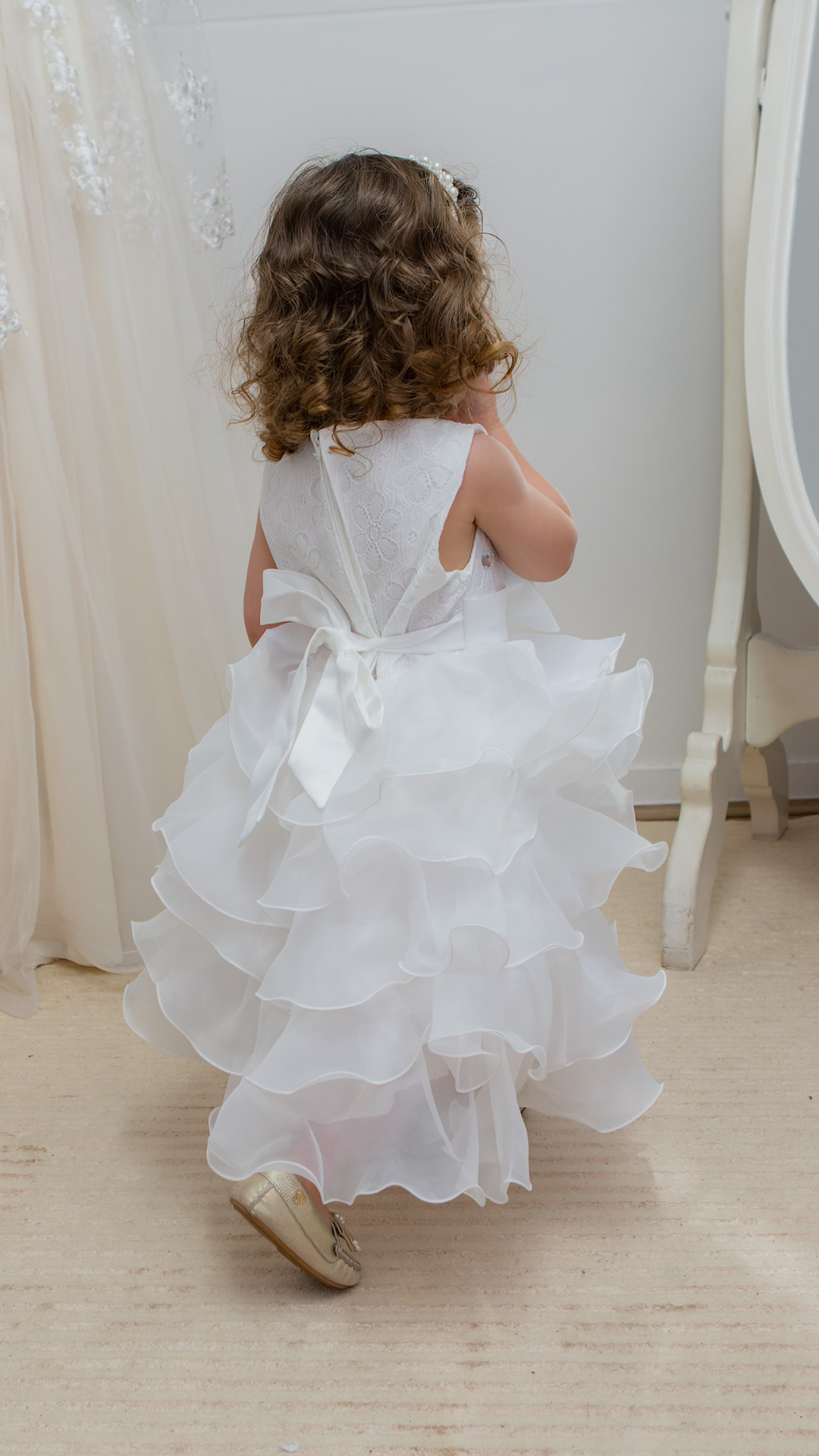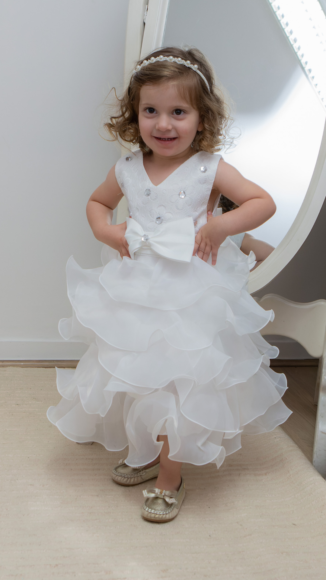 Vestido branco infantil para daminha de honra, com saia volumosa em camadas de organza e corpo bordado em renda com aplicação de cristais. A parte superior possui decote em V e um laço delicado aplicado na cintura frontal, enquanto a parte traseira é finalizada com fechamento em zíper e laço clássico. O modelo transmite leveza e sofisticação, sendo ideal para as pequenas participantes da cerimônia. Perfeito para casamentos tradicionais ou ao ar livre, garantindo charme e conforto.