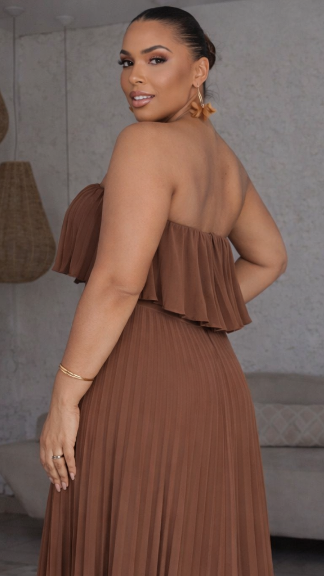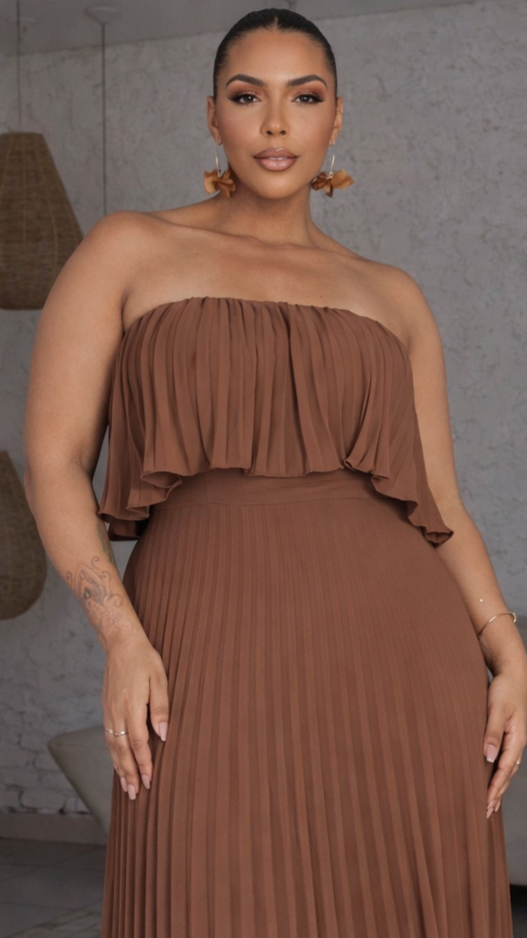 Vestido de festa longo marrom chocolate confeccionado em tecido leve com acabamento plissado. O modelo tomara que caia possui decote reto com babado sobreposto em chiffon, criando efeito fluido e movimento. A modelagem acinturada com saia longa plissada proporciona alongamento da silhueta e caimento elegante. Um vestido elegante e sofisticado, ideal como vestido para casamento, vestido madrinha, vestido para formatura e perfeito para mães de noivos que buscam sofisticação.