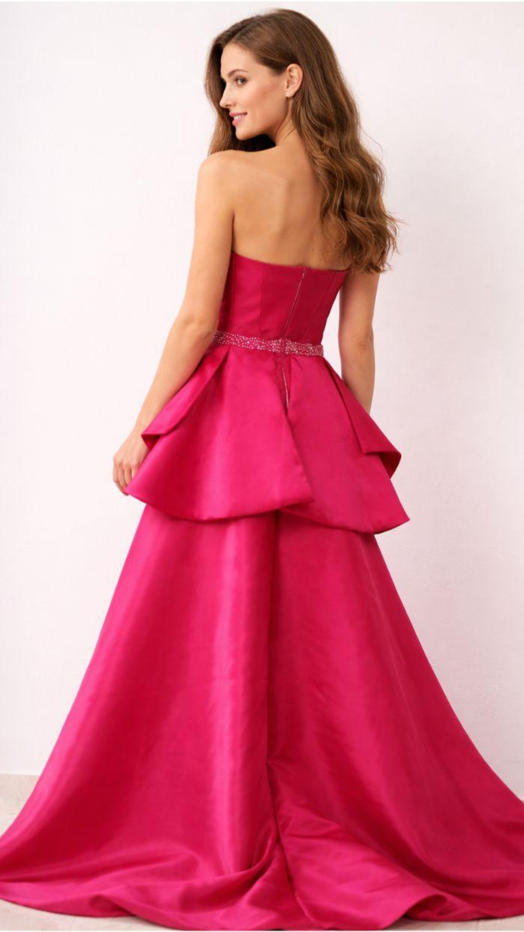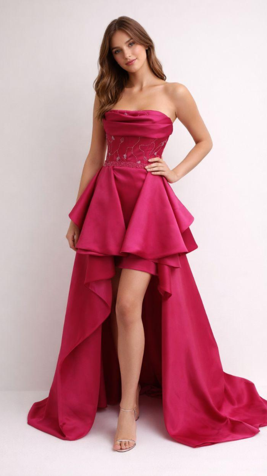 Vestido de festa em tecido Zibeline, na cor rosa pink com estrutura tomara que caia e modelagem acinturada. O corpete possui aplicação de cristais bordado á mão formando desenhos delicados, valorizando a região do busto e da cintura. A peça possui design 2 em 1, com saia longa removível que revela um vestido curto estruturado por baixo. A saia apresenta volume com recortes em camadas e caimento amplo, criando movimento e efeito elegante. O acabamento inclui faixa na cintura com aplicações de cristais, reforçando a silhueta e proporcionando sofisticação ao visual.