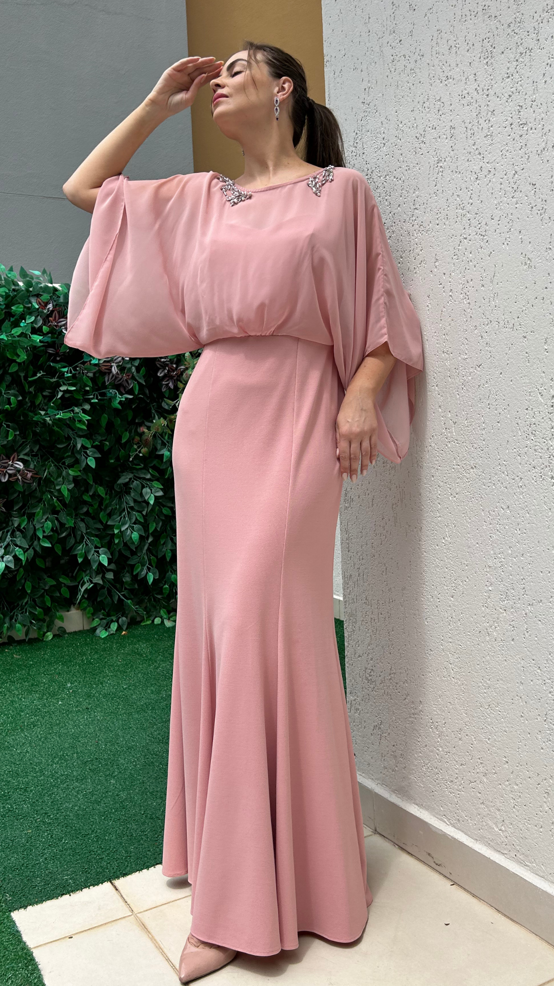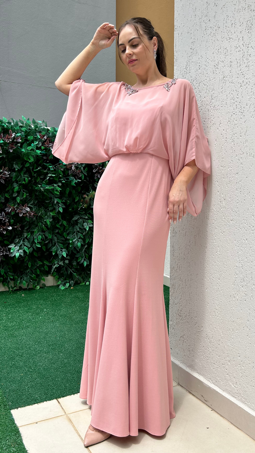 Vestido de Festa Rosé com Manga Ampla e Detalhe em Pedraria nos Ombros