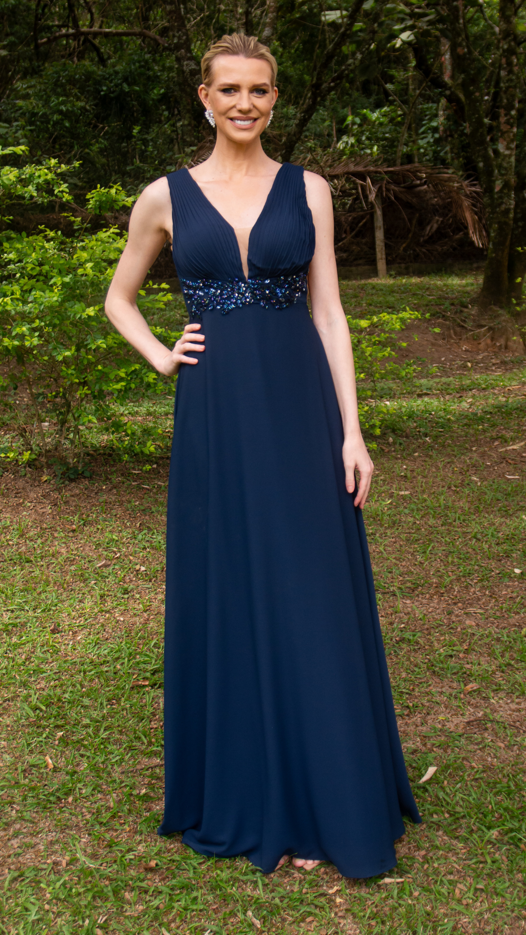 Elegante vestido de festa feminino na cor azul marinho, ideal para madrinhas, formandas e convidadas em eventos noturnos sofisticados. O modelo apresenta corte slim com caimento fluido, valorizando a silhueta de forma natural e sofisticada.