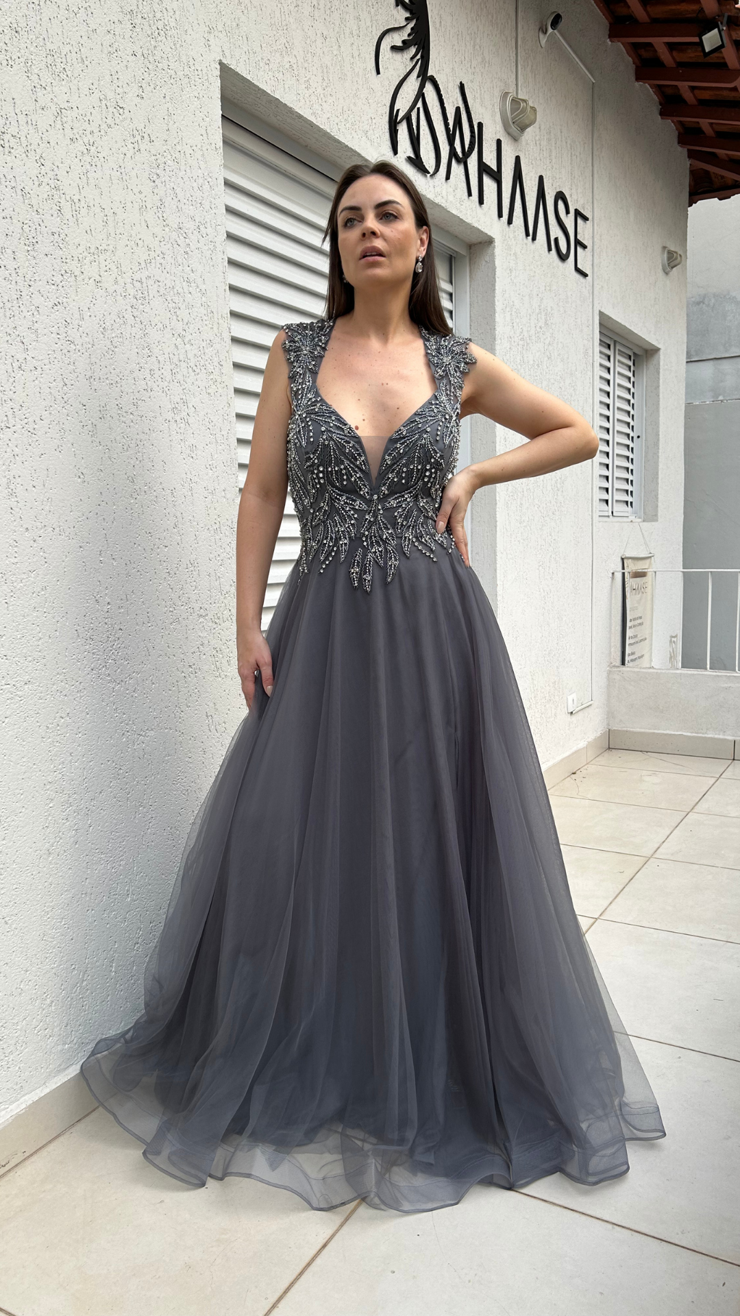 Deslumbrante vestido de festa longo na elegante cor grafite, ideal para madrinhas, formandas, convidadas especiais e eventos noturnos sofisticados. O modelo possui saia em camadas de tule leve com caimento fluido, fenda frontal discreta e movimento gracioso, proporcionando charme e imponência ao caminhar.