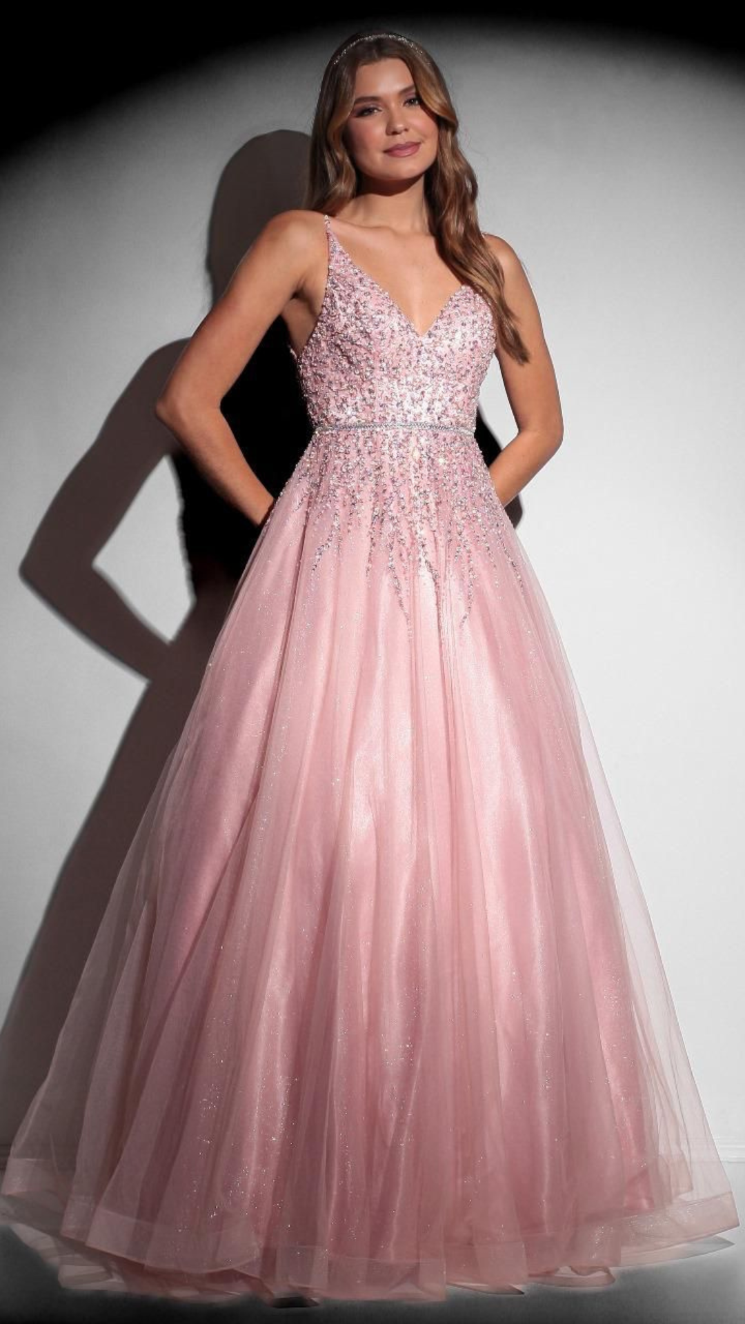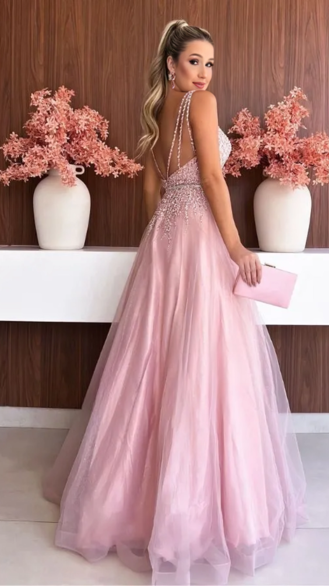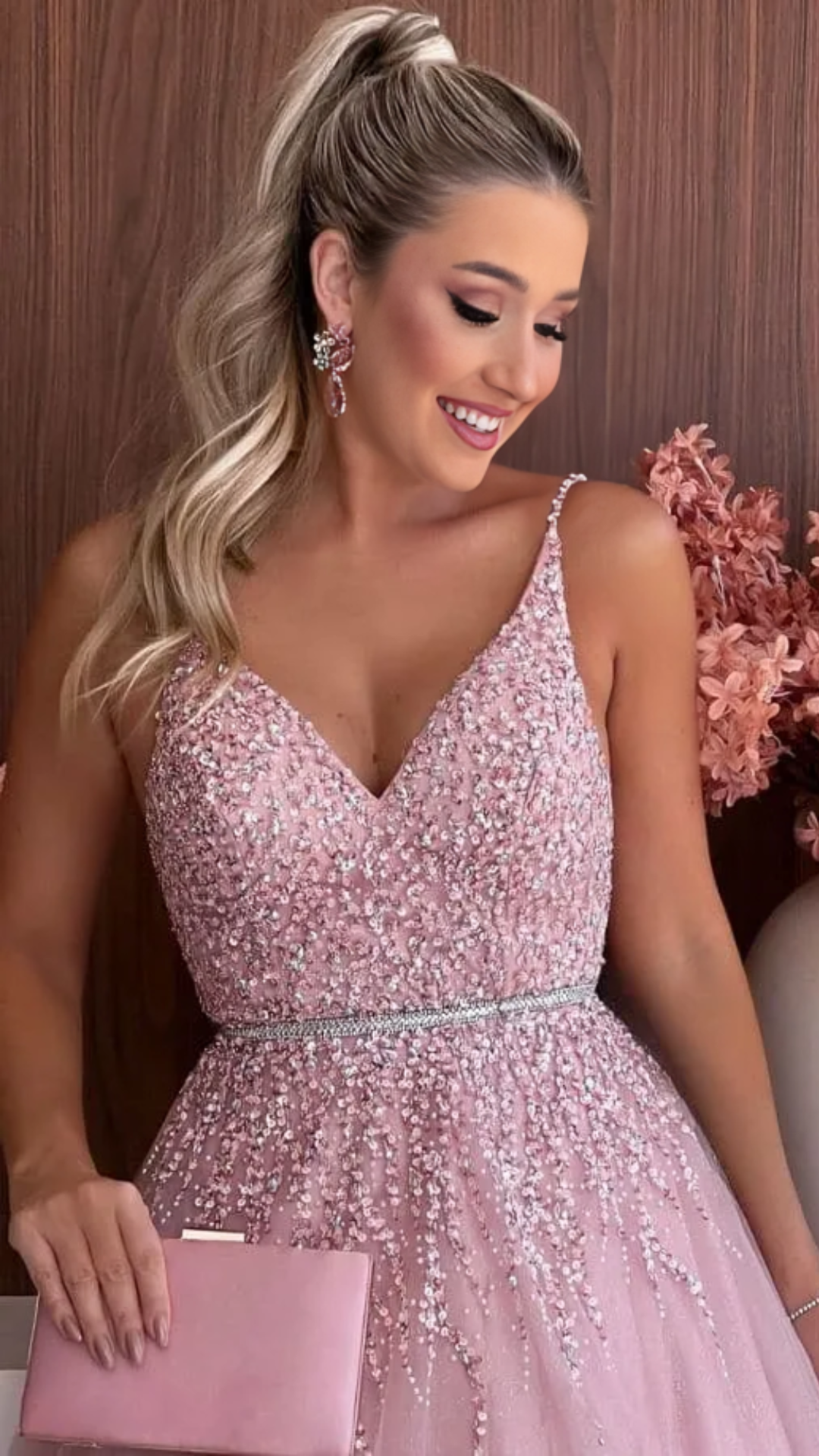 Vestido longo de tule rosa com aplicações bordadas em cristais svarovski, perfeito para debutantes. O modelo apresenta decote em V, alças finas que se tonam alças tripla nas costas. As costas possui decote V que valoriza a silhueta. A saia ampla em tule traz leveza e fluidez ao look, criando um efeito de princesa ideal para a valsa de 15 anos. O acabamento delicado na cintura valoriza a silhueta, garantindo um caimento impecável. Esse é o verdadeiro vestido dos sonhos de uma princesa.