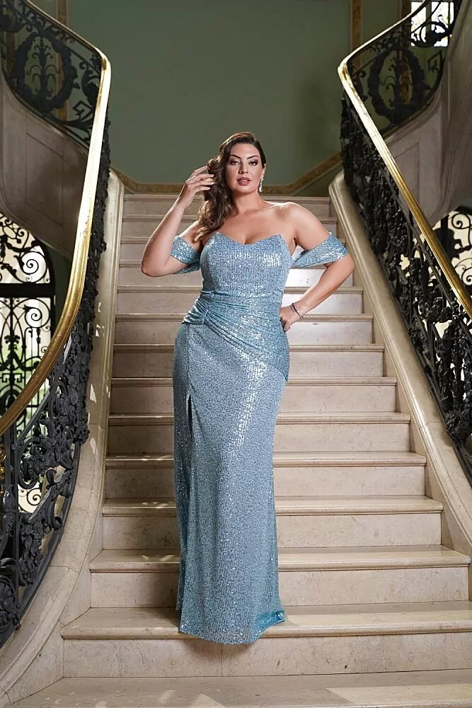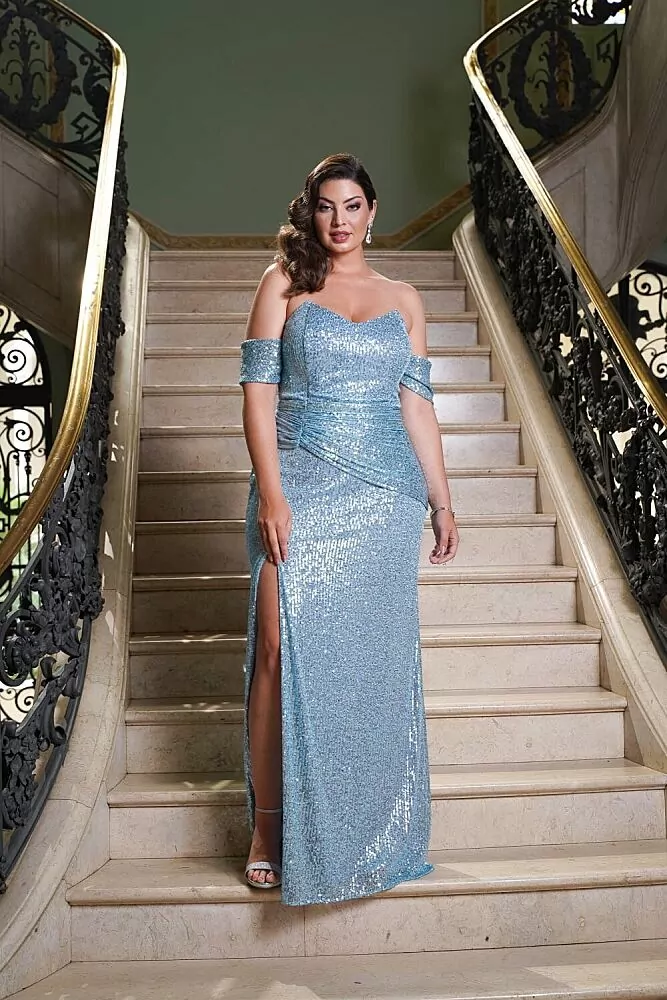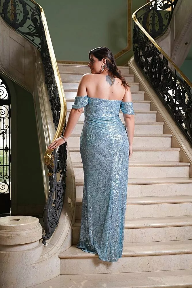 Vestido longo confeccionado em tecido todo bordado com paetês azul serenity, proporcionando brilho elegante e sofisticado. O modelo apresenta decote coração com alças finas e detalhe de alças caídas sobre os ombros, criando um visual moderno e feminino. A cintura marcada realça as curvas de forma sutil, enquanto o drapeado frontal favorece a silhueta e acrescenta movimento. A fenda frontal alonga a perna, equilibrando sensualidade e elegância. Ideal para madrinhas, formandas e convidadas que desejam um visual impactante com muito brilho e caimento impecável.