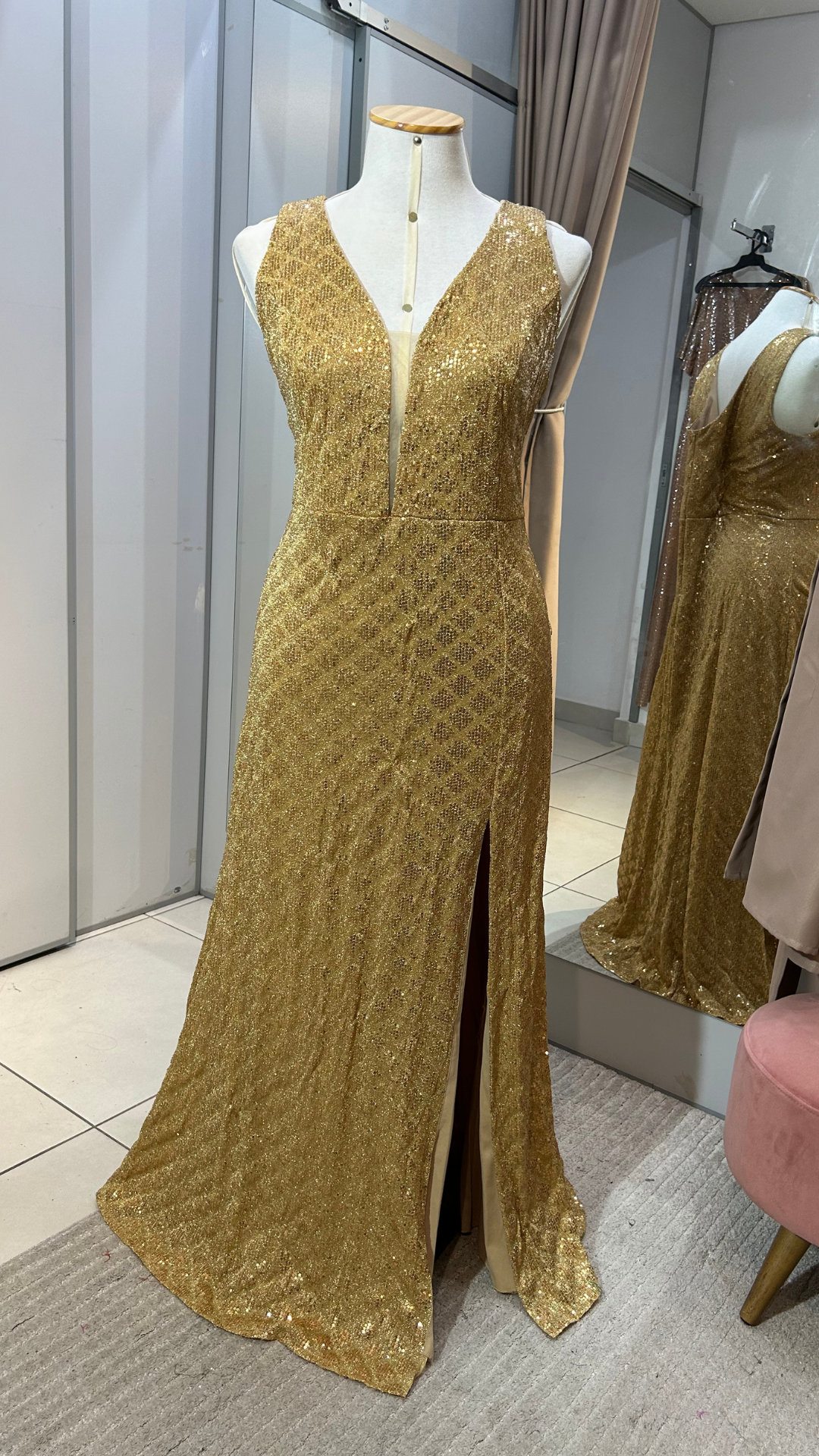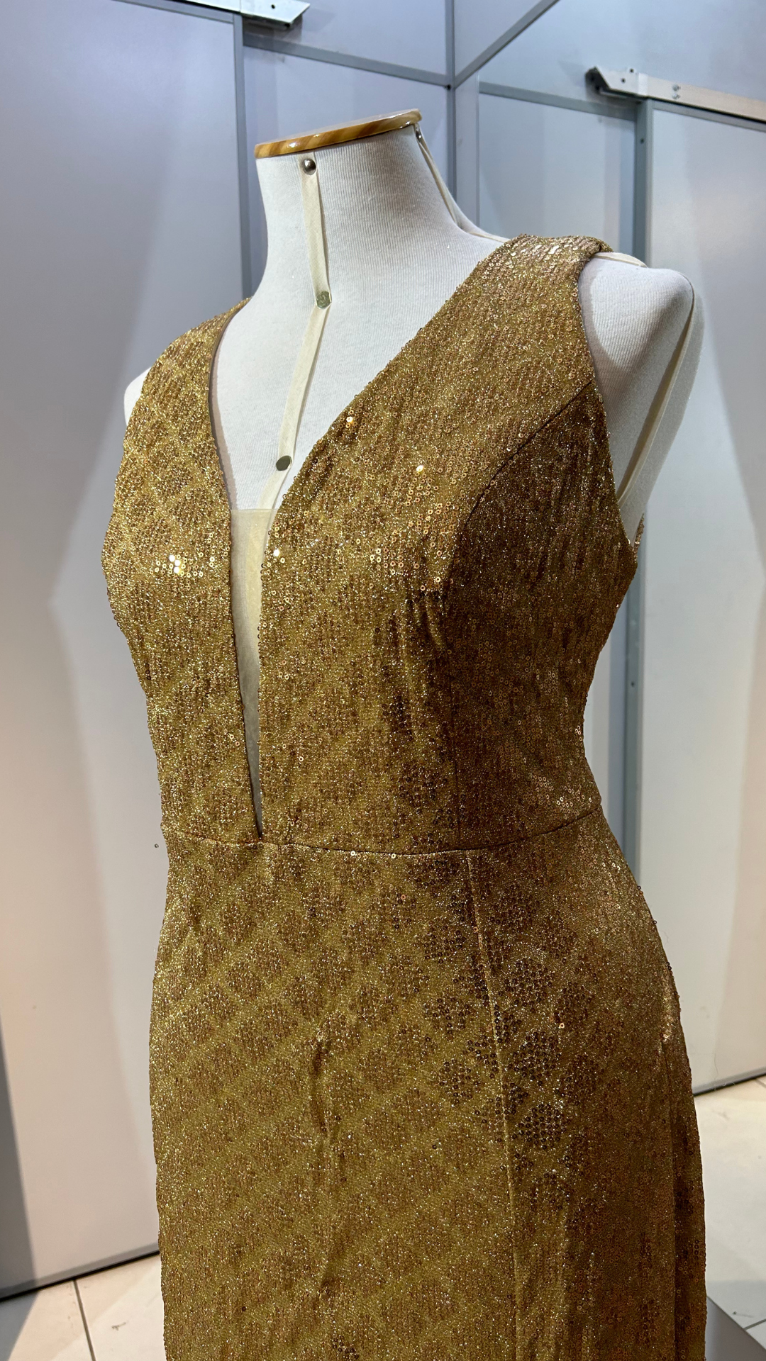 Vestido longo dourado confeccionado em tecido bordado com paetês formando padrão geométrico. A peça apresenta decote profundo em “V” com transparência discreta, que alonga a silhueta e valoriza o colo. Possui modelagem ajustada ao corpo até o quadril, com saia levemente evasê e fenda frontal, garantindo sofisticação e movimento. Ideal para eventos formais, o brilho dourado confere destaque e elegância na medida certa.