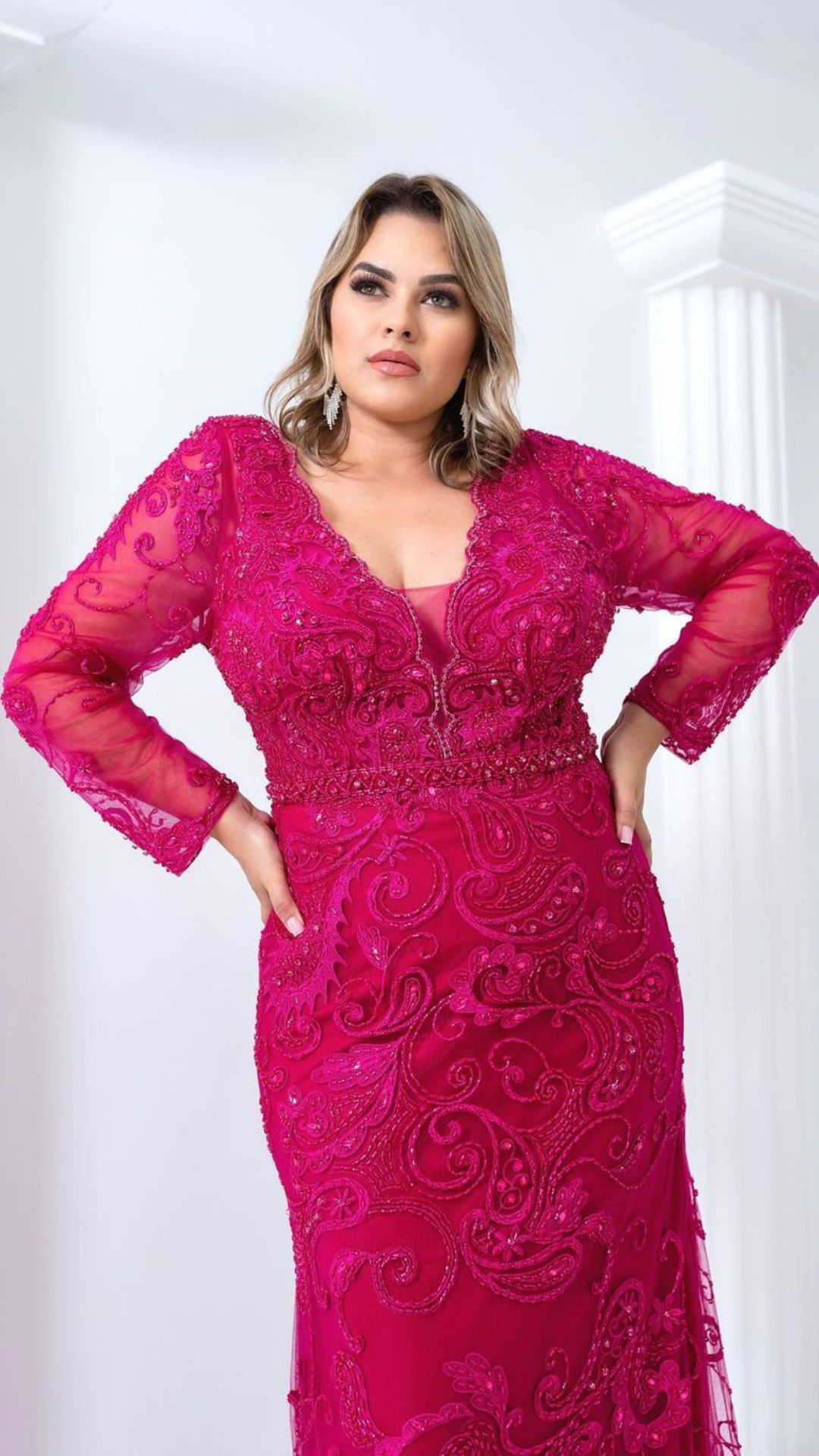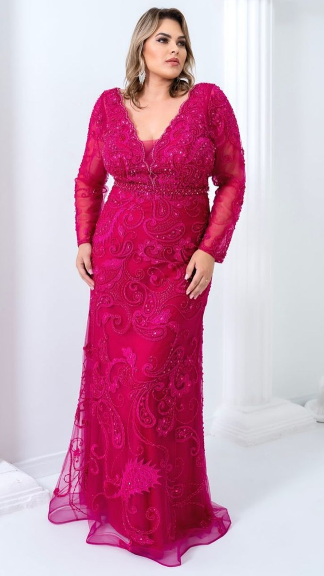 Vestido longo em tule bordado com pedrarias e aplicações artesanais, em tom fúcsia vibrante. A peça conta com decote em V frontal e posterior, com recorte estratégico que valoriza o colo e equilibra a silhueta. A manga longa em tule bordado acrescenta sofisticação e delicadeza. A cintura é marcada com bordado contínuo, criando um efeito visual alongador e elegante. O bordado arabesco com cristais e aplicações estilo swarovski garante brilho na medida certa, ideal para eventos noturnos e ocasiões especiais que pedem requinte.
