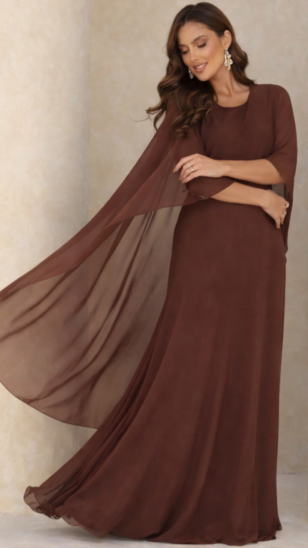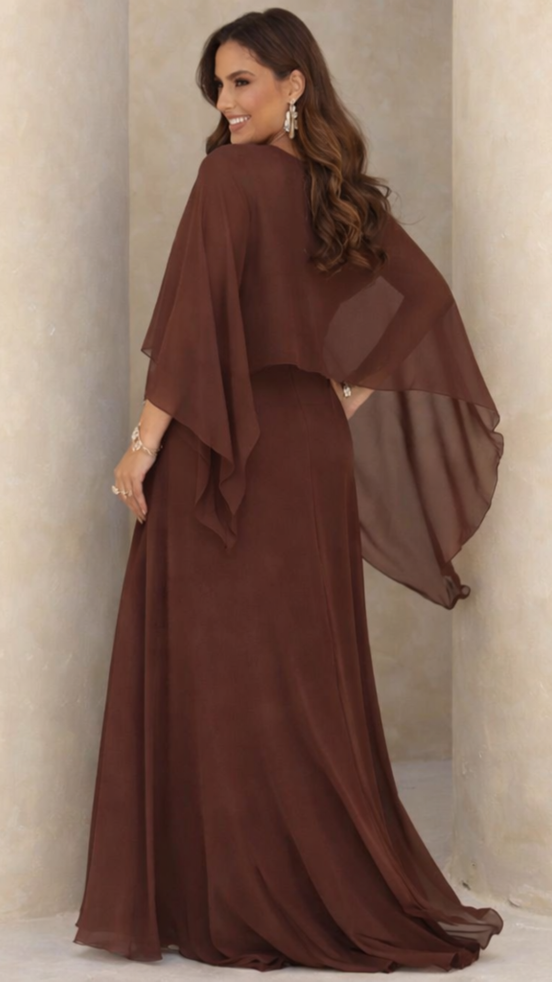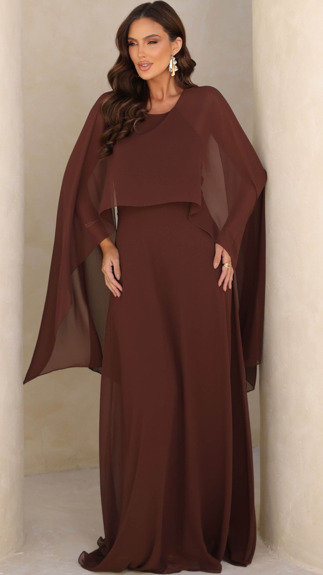 Vestido Longo Marrom Chocolate com Manga Capa em Chiffon Elegante