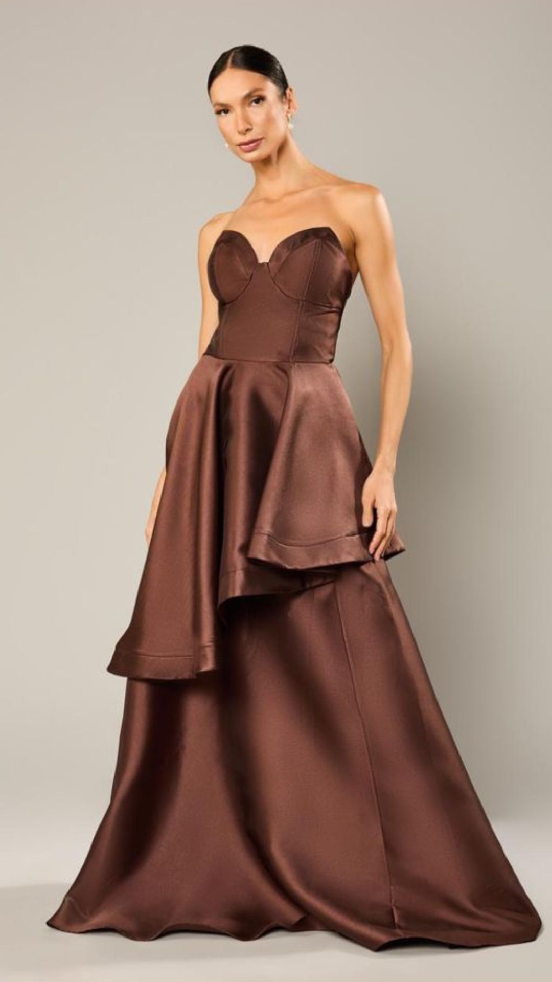 Vestido longo em marrom chocolate confeccionado em tecido estruturado com leve brilho acetinado. Possui decote coração tomara que caia com recortes que valorizam o busto e modelagem ajustada ao tronco. A cintura é marcada e a saia apresenta modelagem ampla com sobreposição assimétrica na parte frontal, criando efeito arquitetônico e sofisticado. Silhueta acinturada com volume equilibrado na parte inferior, ideal para eventos formais e produções de impacto.