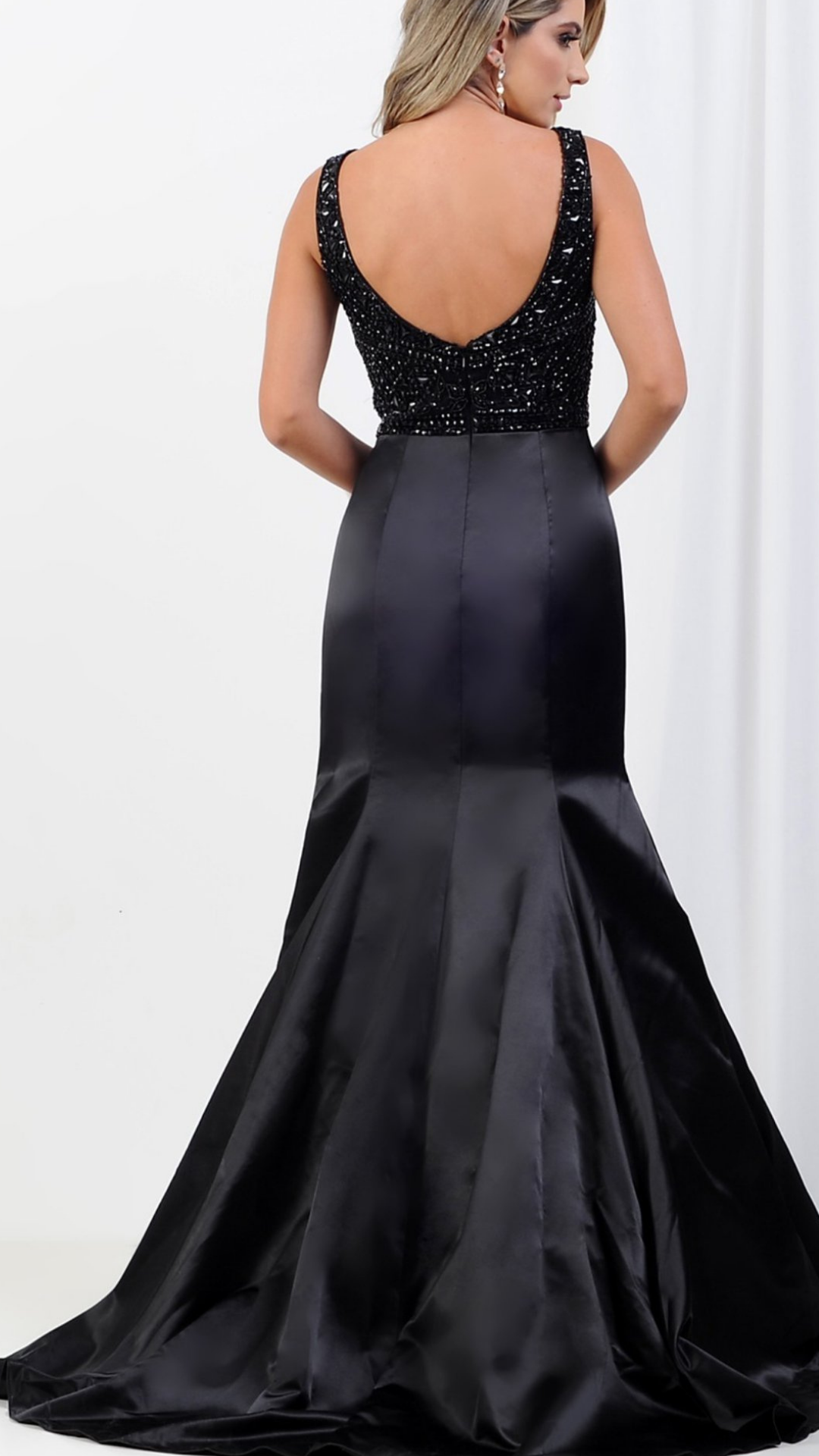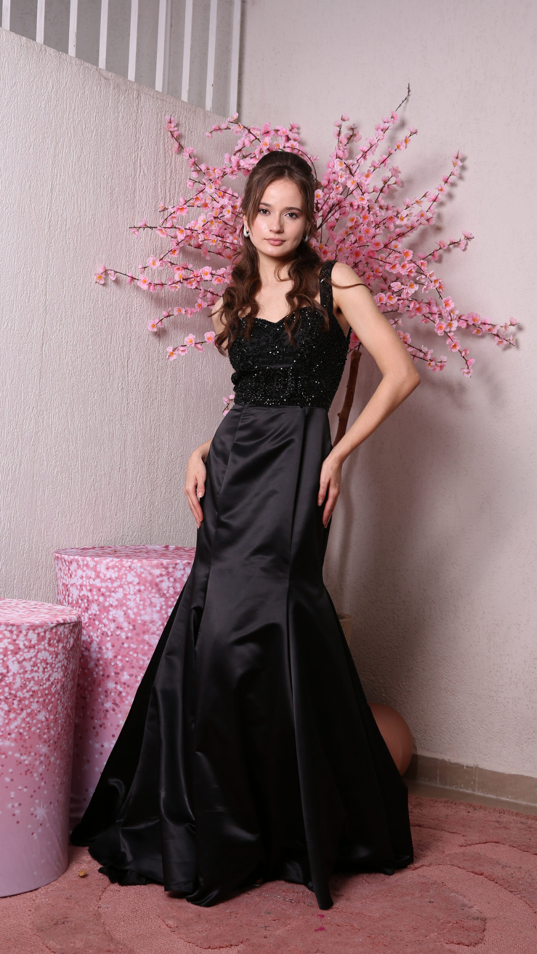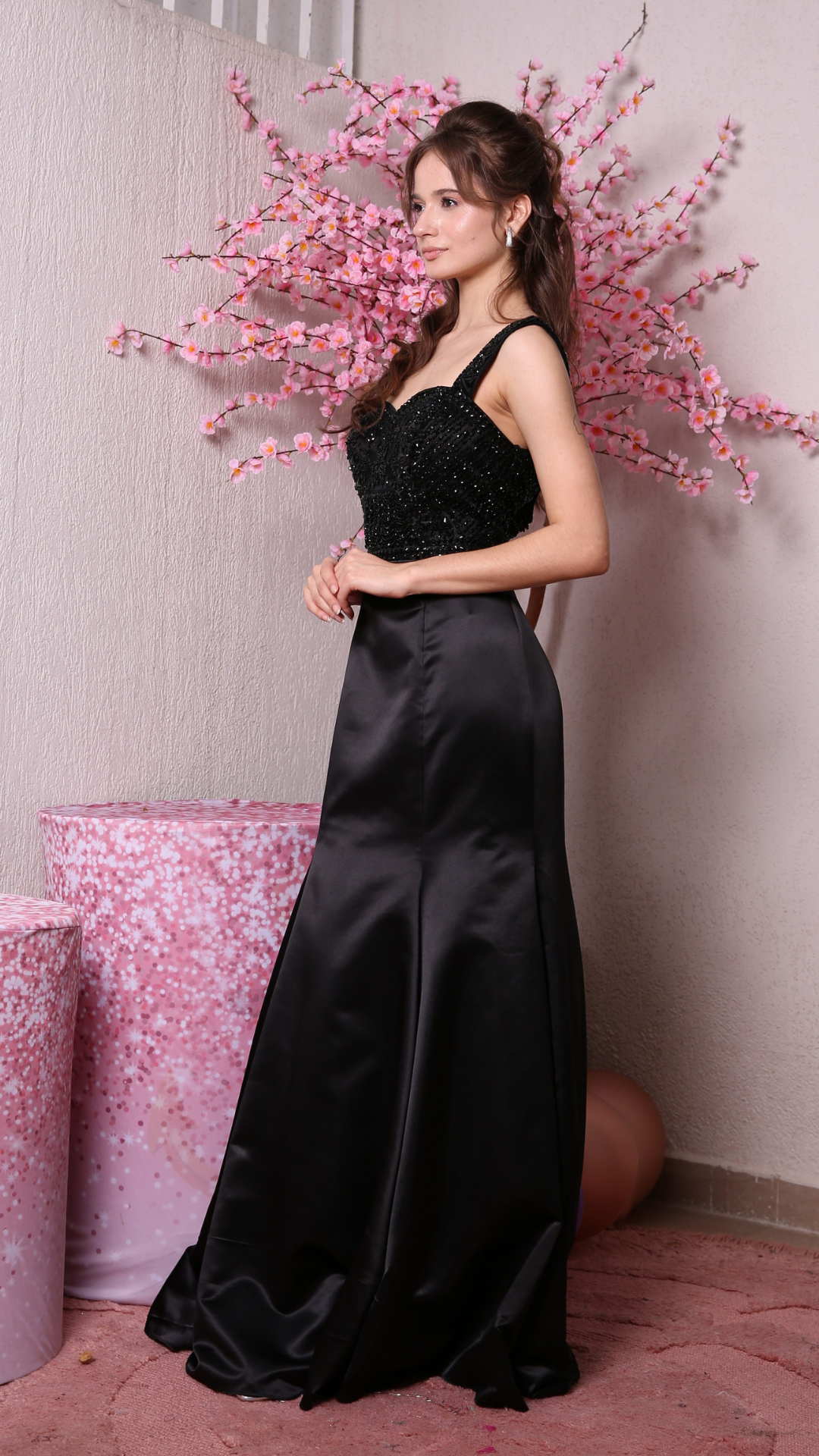 Vestido longo em cetim com caimento estruturado e modelagem sereia, ideal para valorizar a silhueta feminina. O busto estruturado é ricamente bordado com pedrarias e cristais pretos, formando desenhos florais e geométricos que conferem sofisticação e destaque à parte superior da peça. A alça larga e o decote coração proporcionam sustentação e equilíbrio visual. As costas apresentam decote em “U”, complementando o design com elegância. A saia em cetim acetinado traz brilho sutil, fluidez e estrutura, finalizada em barra com leve godê. Peça impactante e ideal para eventos noturnos que exigem um look marcante e sofisticado.