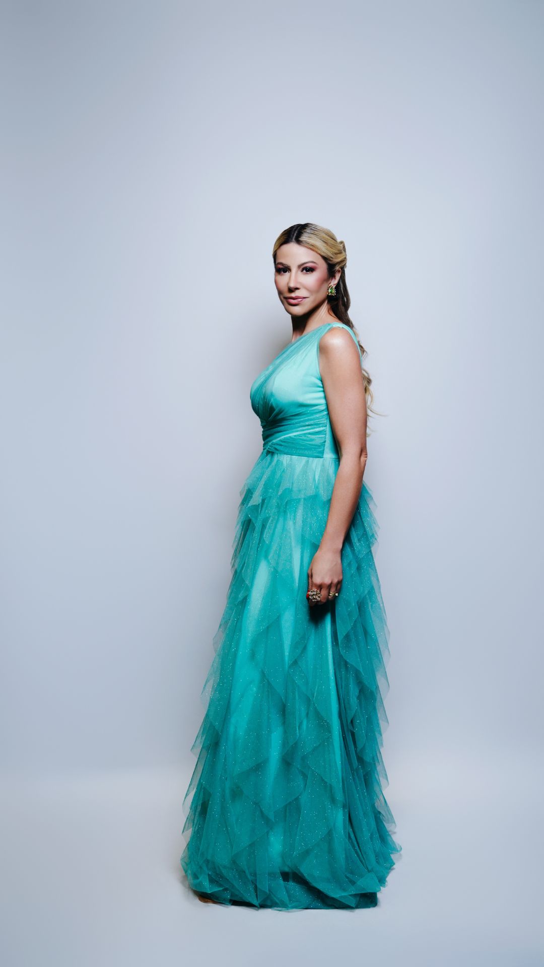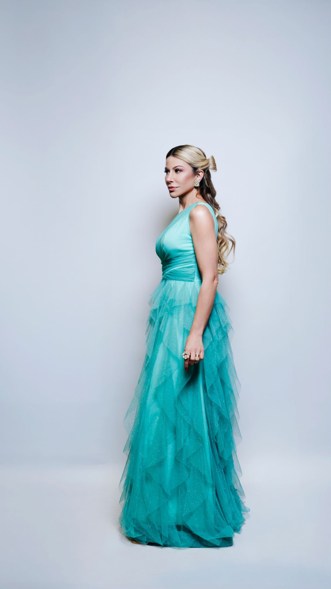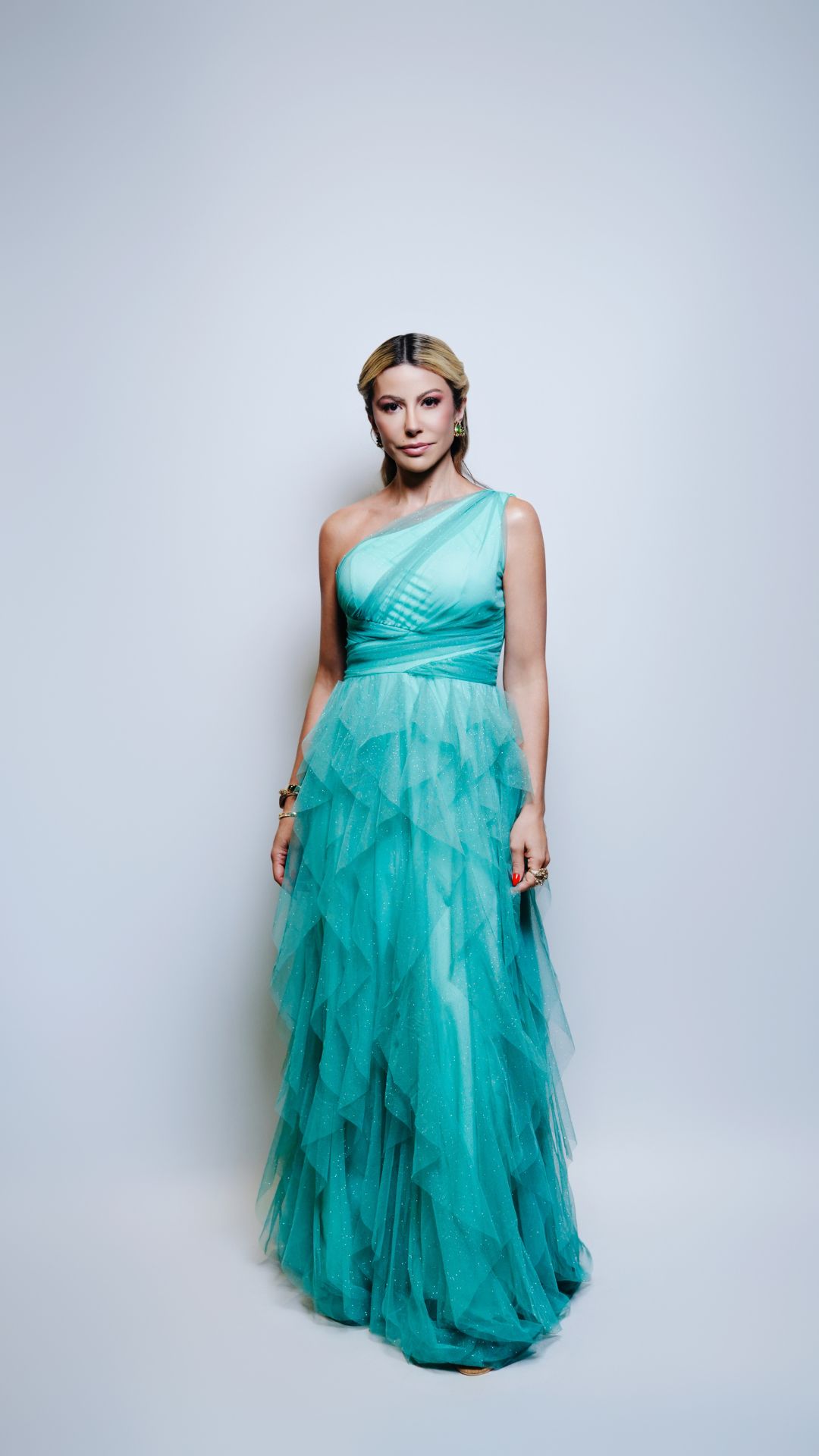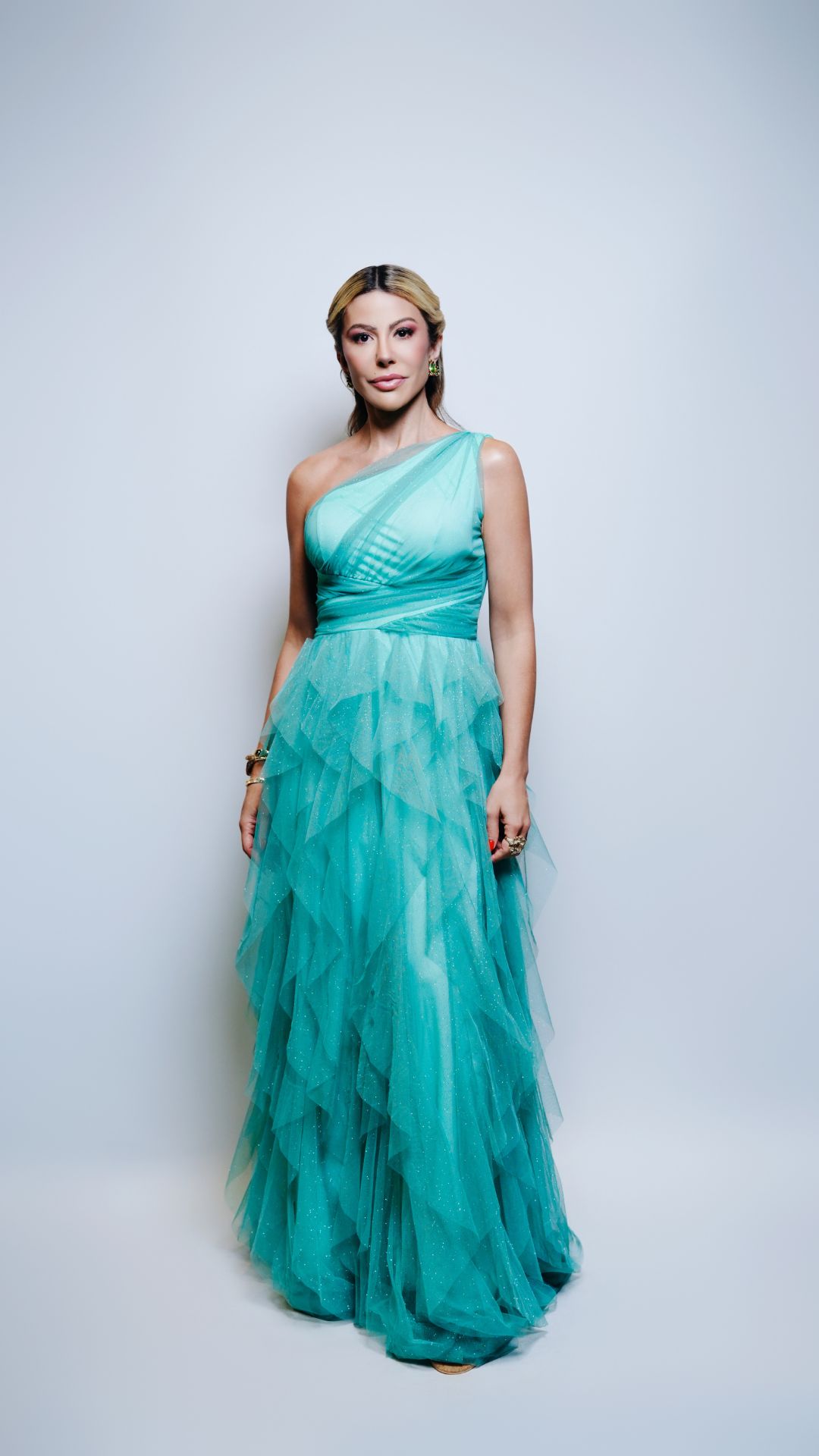 Vestido longo em tule na cor verde água com leve brilho aplicado no tecido. Modelo de um ombro só com decote assimétrico e sobreposição de tule no busto formando leve drapeado. Cintura marcada com faixa estruturada que valoriza a silhueta. Saia longa em camadas de babados assimétricos, proporcionando volume e movimento. Comprimento até o chão. Modelo fluido, ideal para eventos formais e produções românticas.
