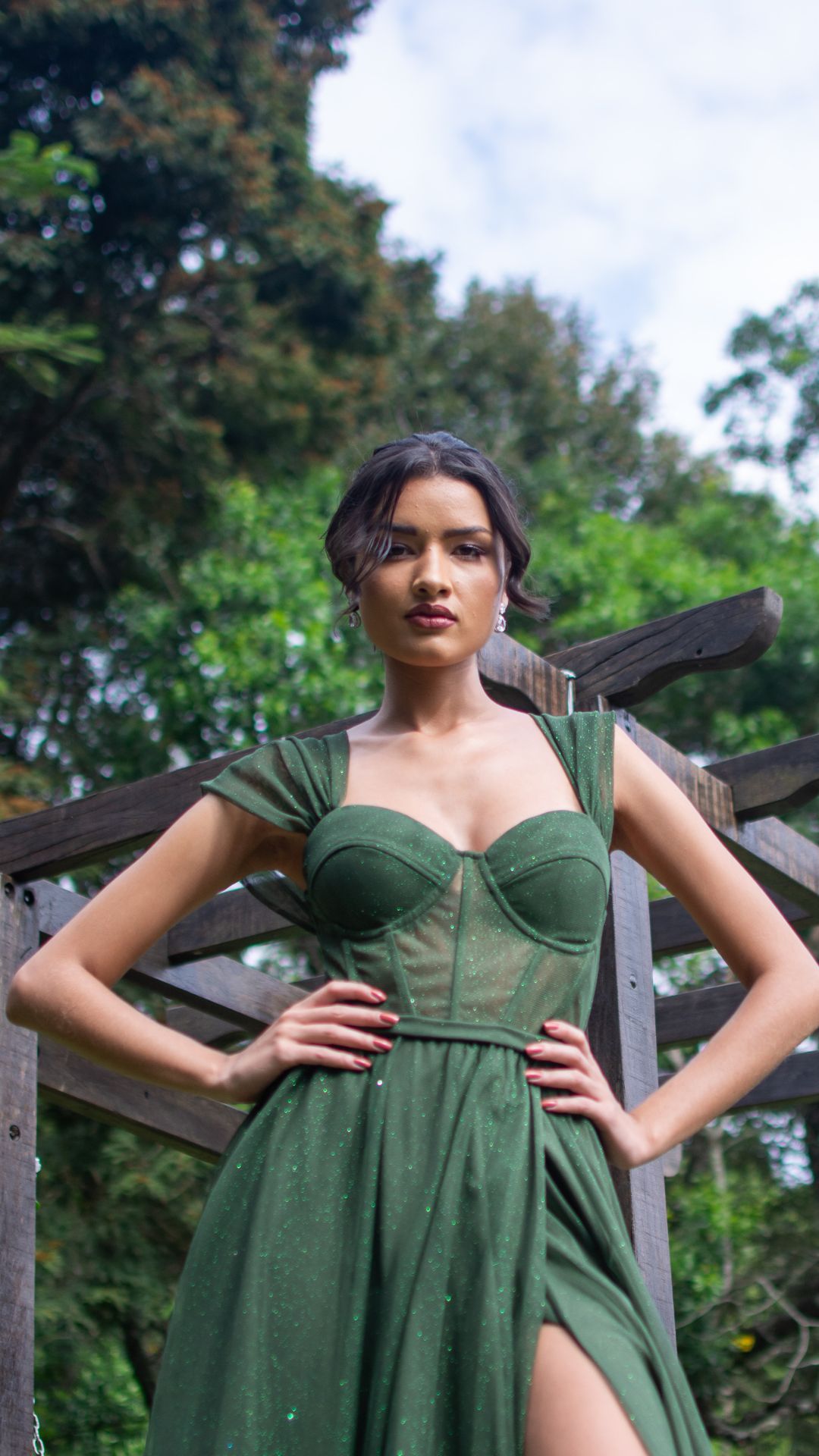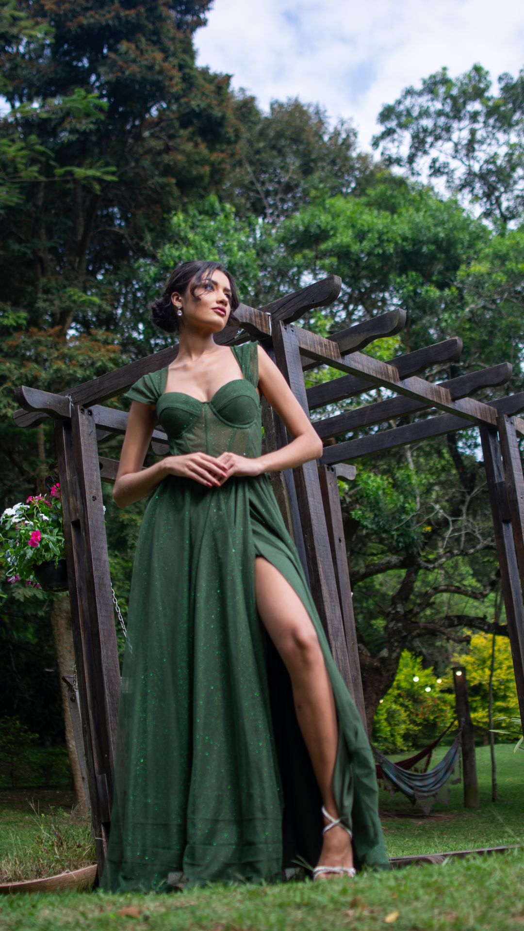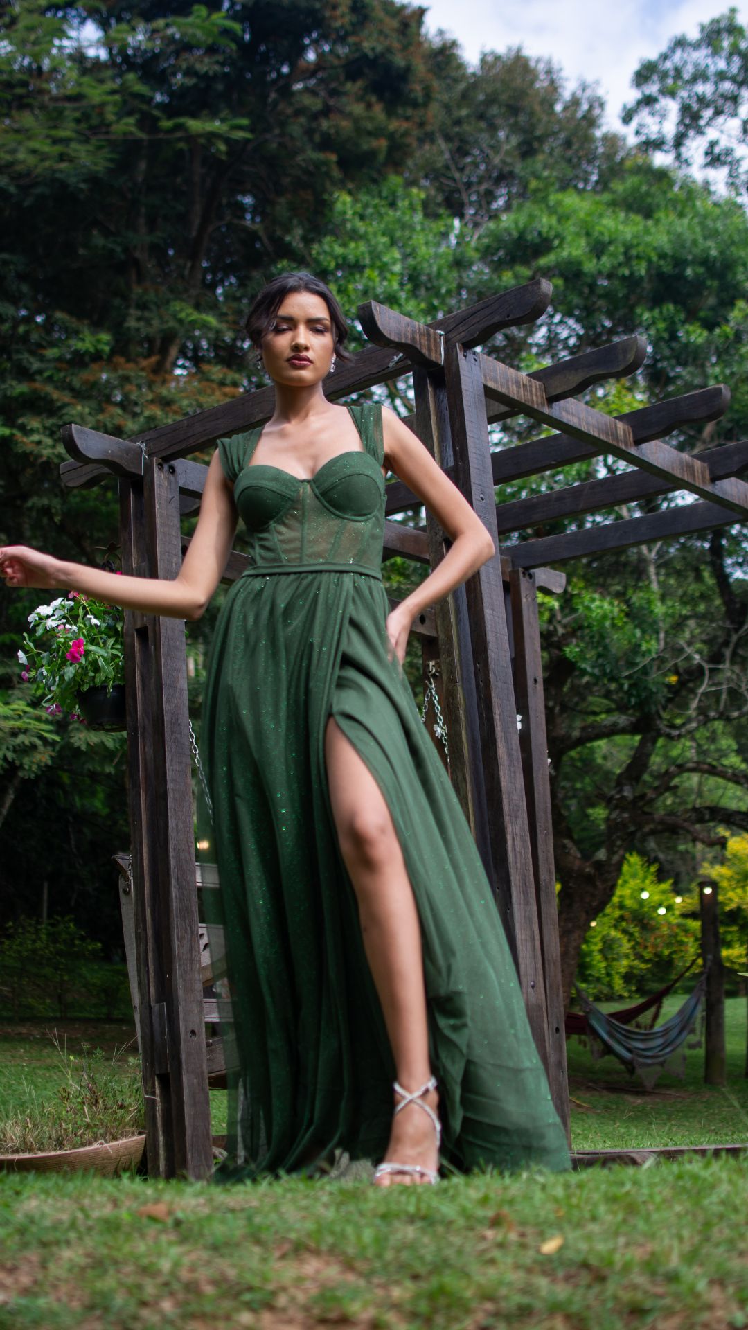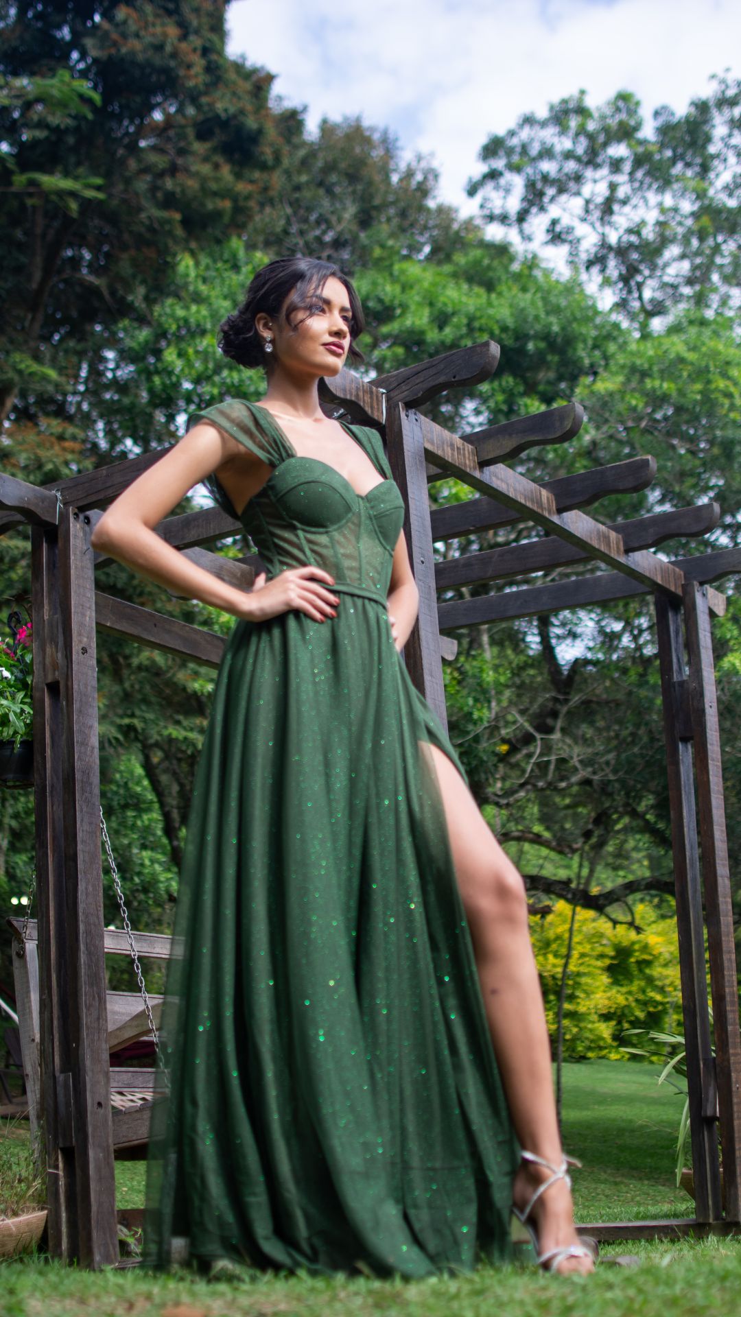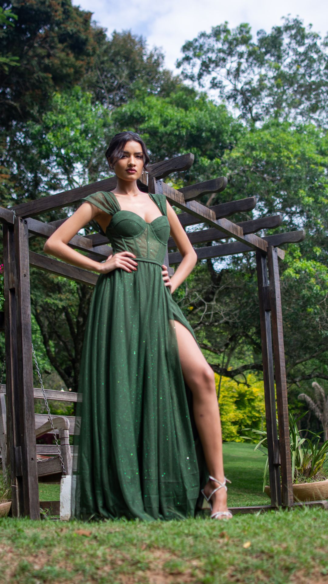Vestido longo em verde esmeralda com brilho sutil e acabamento sofisticado. O modelo possui corpete estruturado com recortes que valorizam o busto e proporcionam sustentação, criando uma silhueta elegante e bem definida.