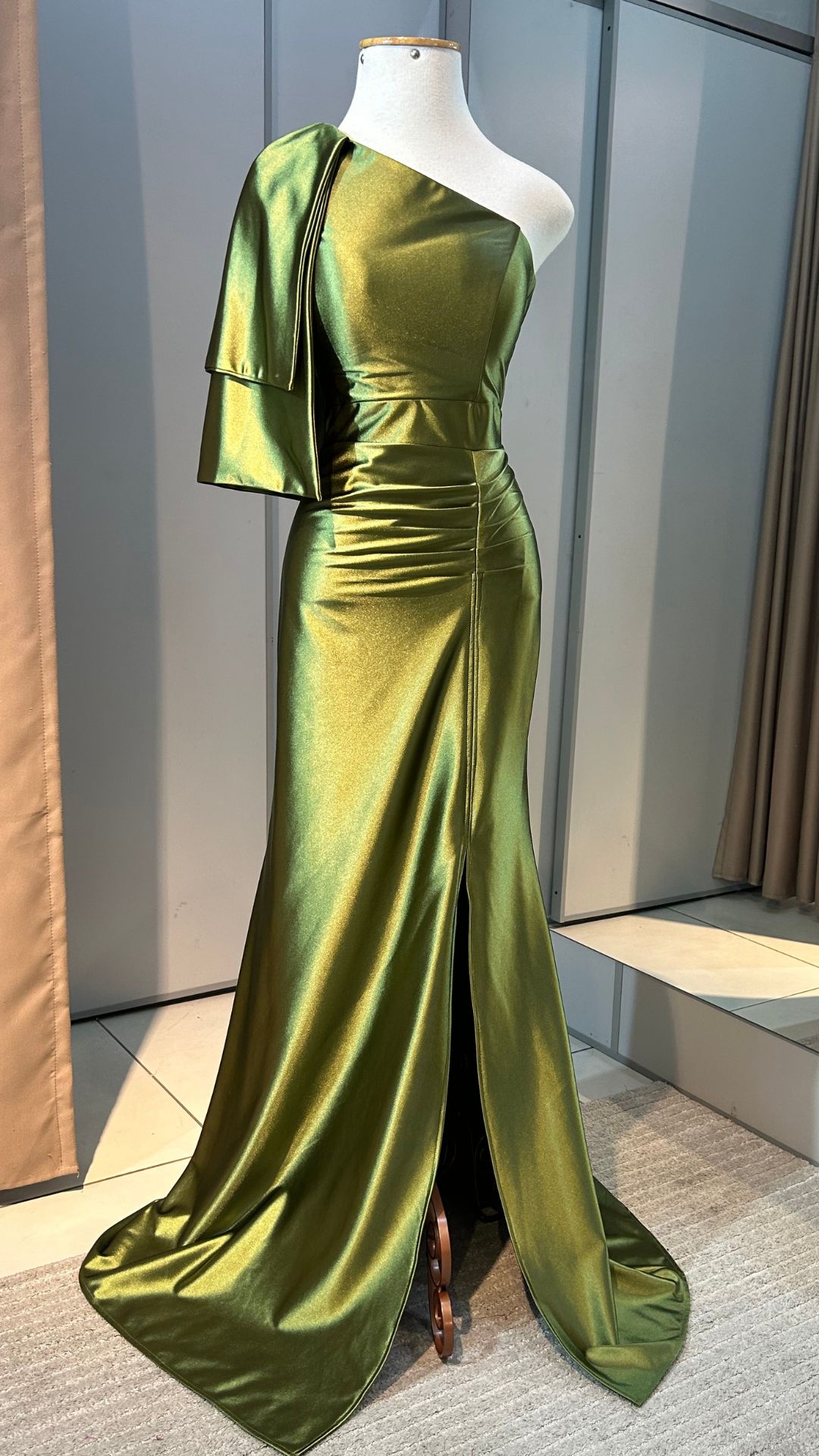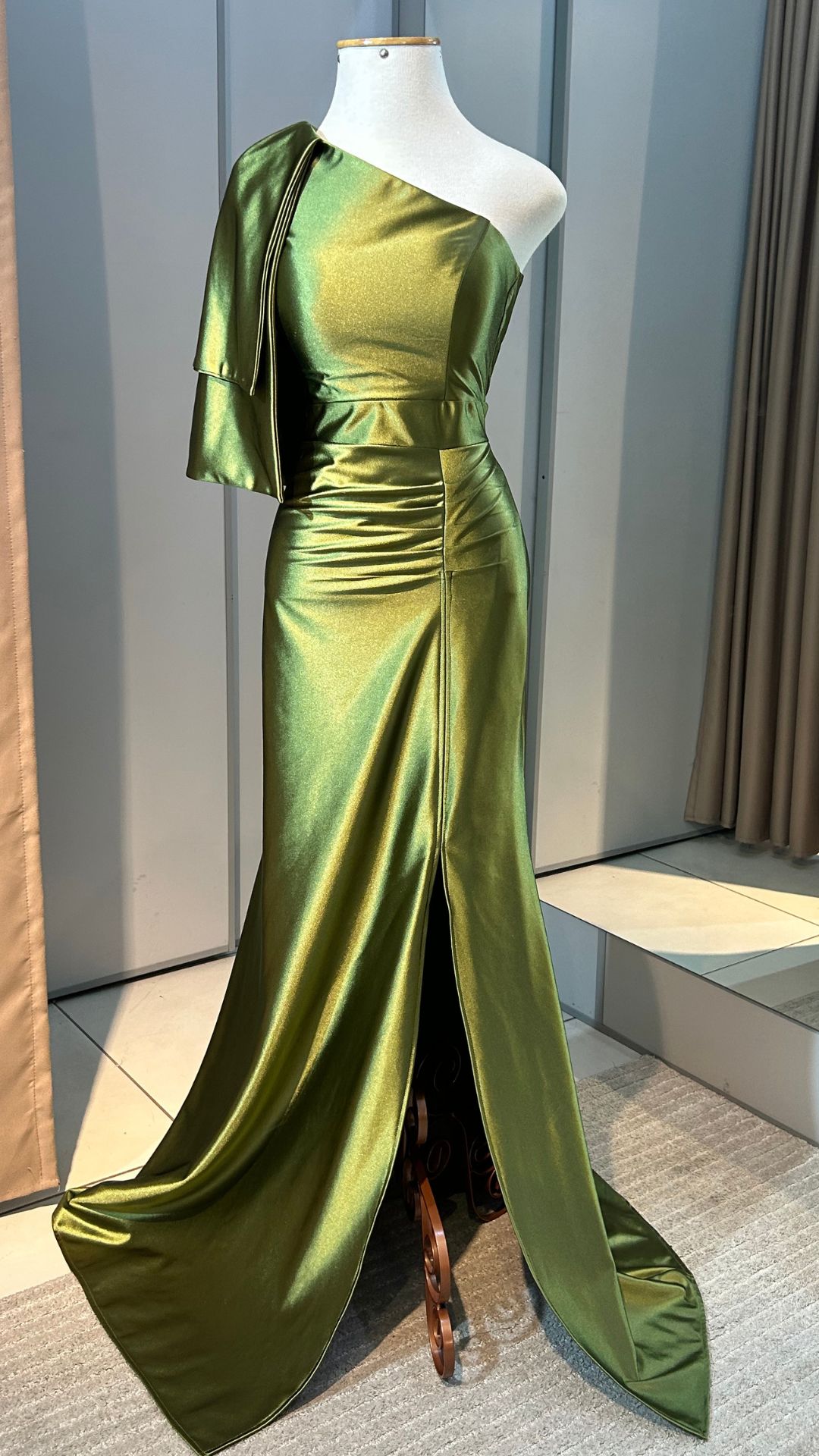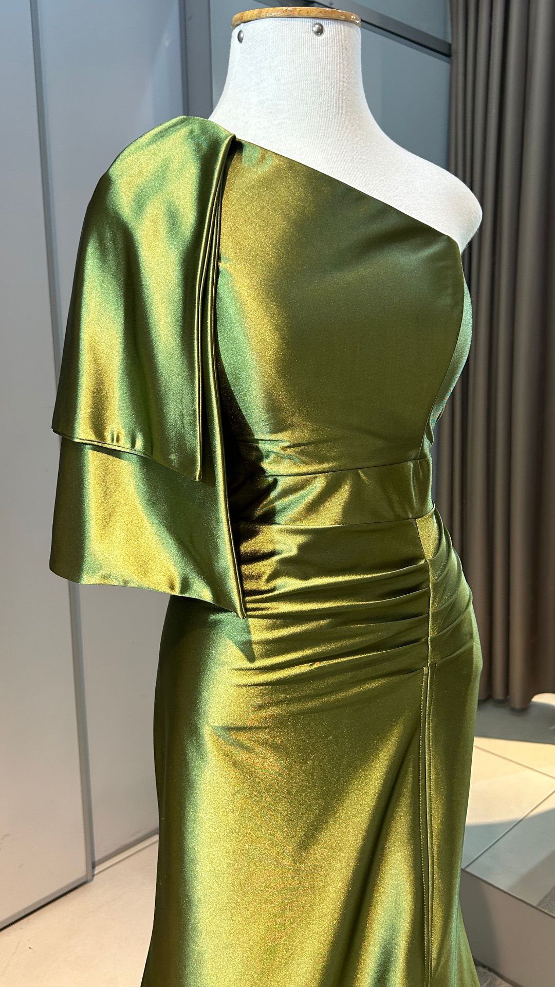 Vestido longo em tecido acetinado com acabamento metálico verde oliva, modelagem ajustada e recorte assimétrico com um ombro só. A peça possui detalhe de drapeado leve na lateral da cintura e capa estruturada sobre o ombro, que traz sofisticação e movimento ao visual. A fenda frontal acentuada adiciona sensualidade e modernidade à proposta. Ideal para eventos noturnos e sofisticados, o vestido valoriza a silhueta com elegância, sendo uma escolha de destaque para quem busca imponência e estilo em uma única peça.
