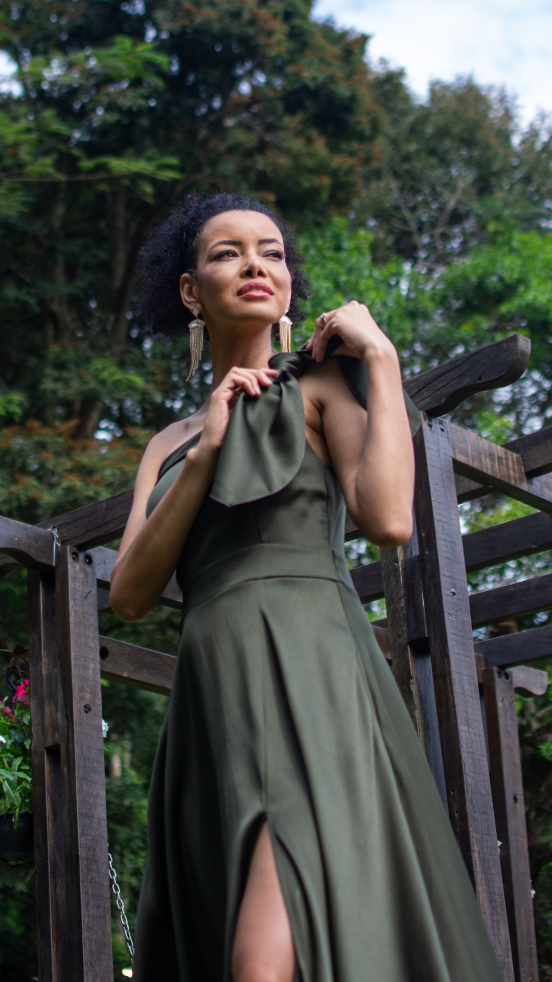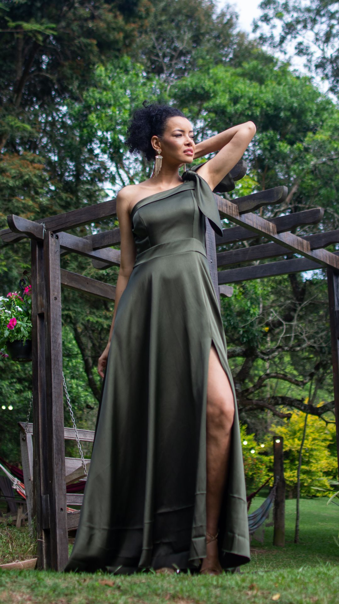 Vestido longo em verde oliva com modelagem sofisticada e acabamento impecável. O modelo possui decote assimétrico de um ombro só com detalhe em laço estruturado, que adiciona charme e personalidade à produção.