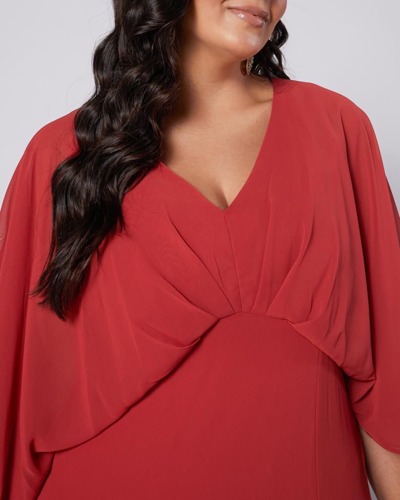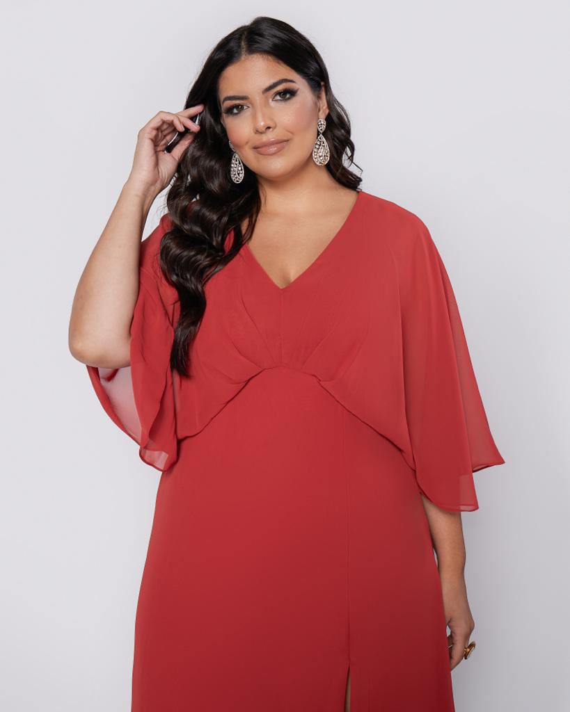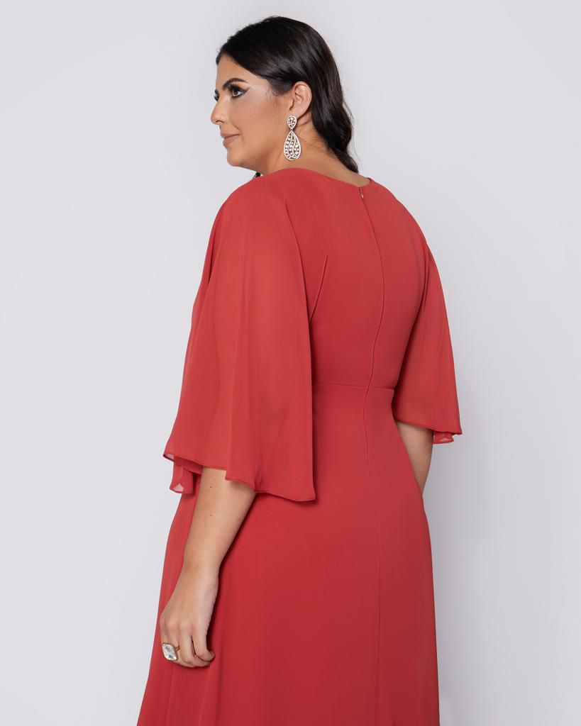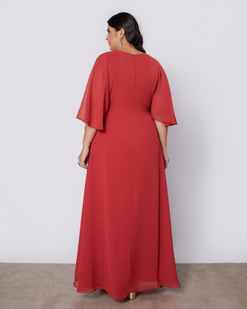 Vestido longo em tom vermelho, confeccionado em tecido leve e fluido, ideal para quem busca um visual elegante e contemporâneo.