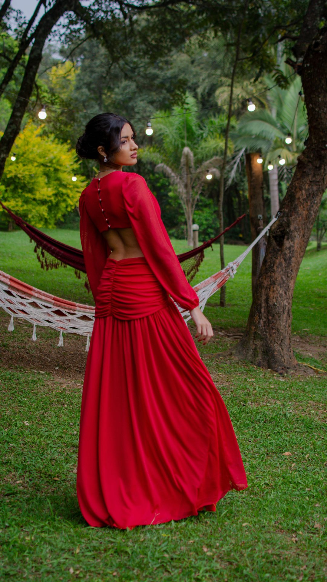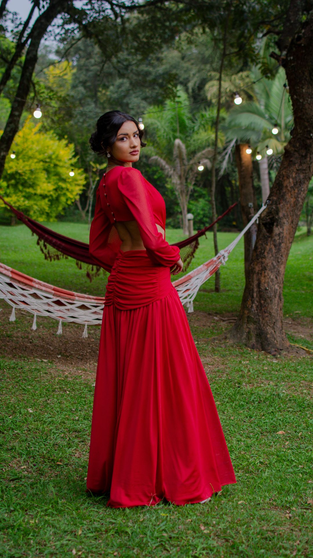 Vestido longo em vermelho intenso com design sofisticado e contemporâneo. O modelo possui decote profundo em V, mangas longas fluidas e recortes laterais estratégicos que valorizam a silhueta com elegância e sensualidade na medida certa.
