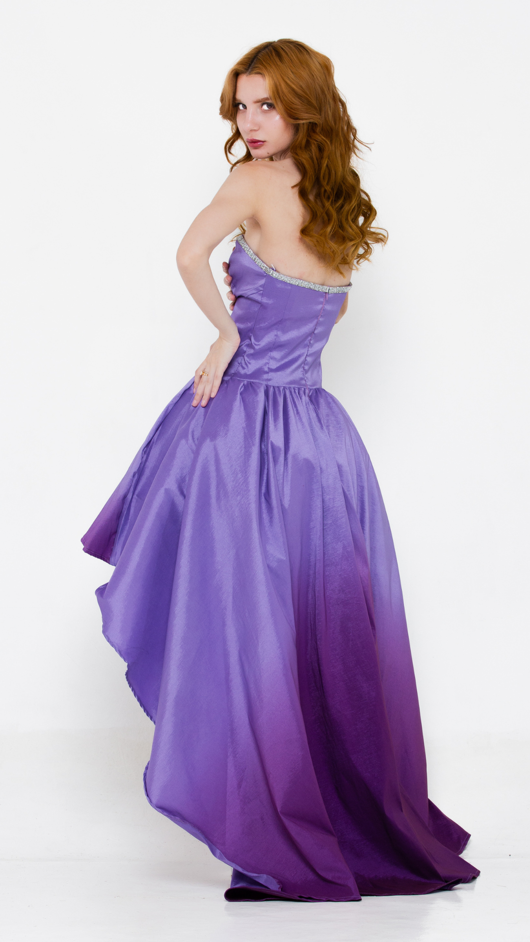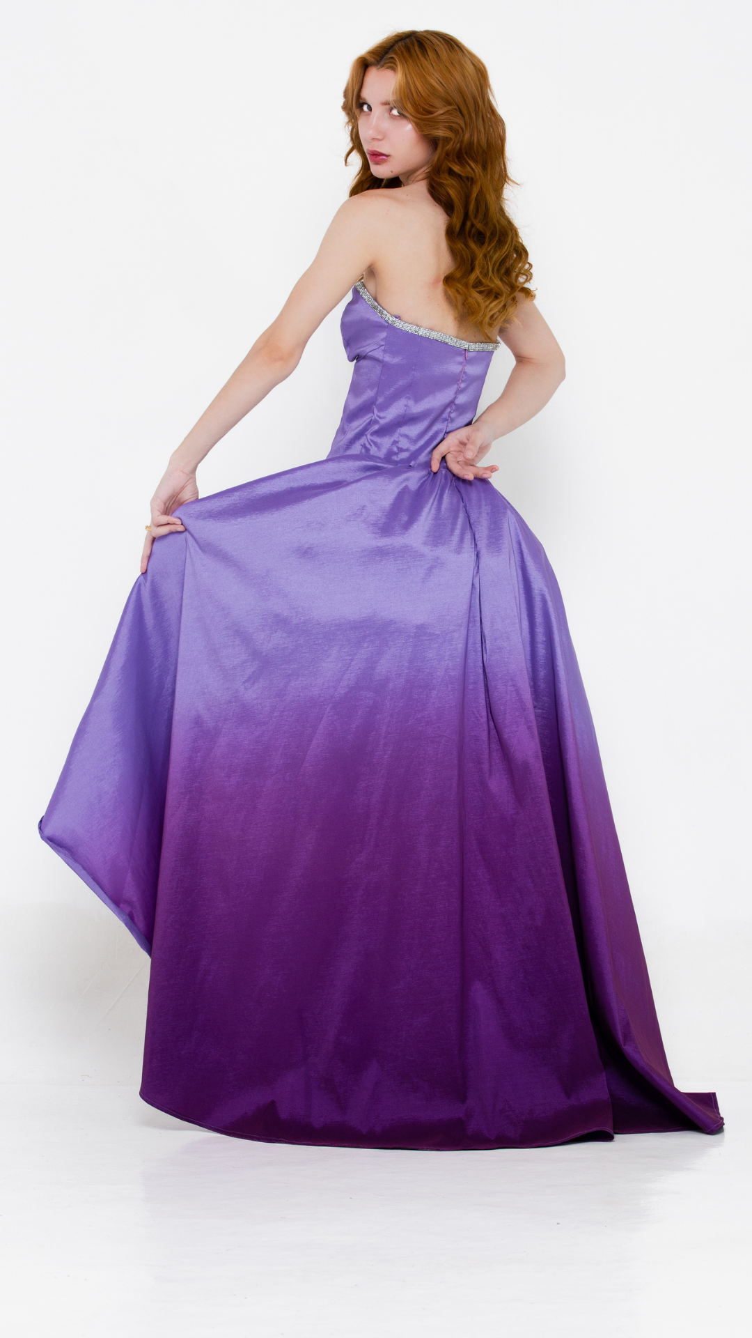 Vestido mullet em tafetá com brilho acetinado na tonalidade lavanda, com degradê roxo na parte inferior. A peça apresenta decote coração tomara que caia, com aplicação de cristais na borda do busto, destacando o colo com elegância. O modelo possui corpo estruturado estilo princesa, que valoriza a cintura, e saia com modelagem mullet, mais curta na frente e com cauda longa nas costas, criando um visual moderno e sofisticado para ocasiões festivas. O tecido encorpado garante volume à saia, com movimento fluido e marcante.