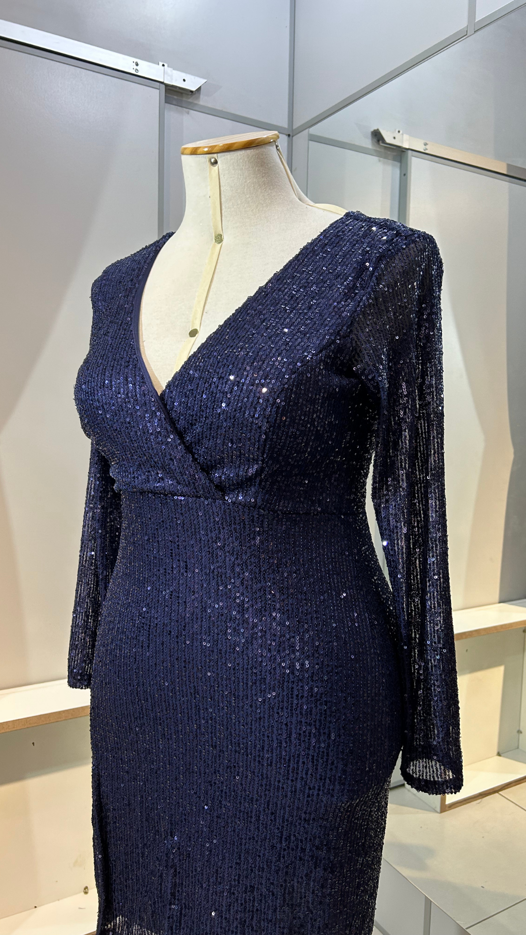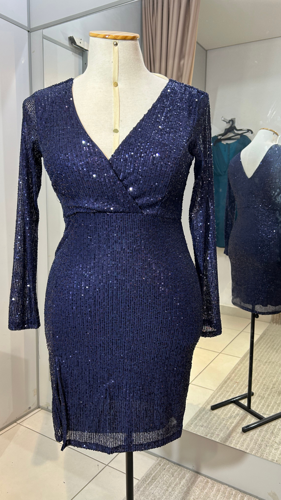 Vestido curto estilo tubinho confeccionado em tecido com paetês azul marinho. Possui decote em “V” transpassado que valoriza o colo e alonga a silhueta. A peça conta com mangas longas e forro interno, garantindo conforto e elegância. O corte ajustado ao corpo destaca a silhueta feminina, enquanto a fenda discreta na barra frontal adiciona charme ao visual. Ideal para eventos noturnos, o brilho dos paetês oferece sofisticação na medida certa.