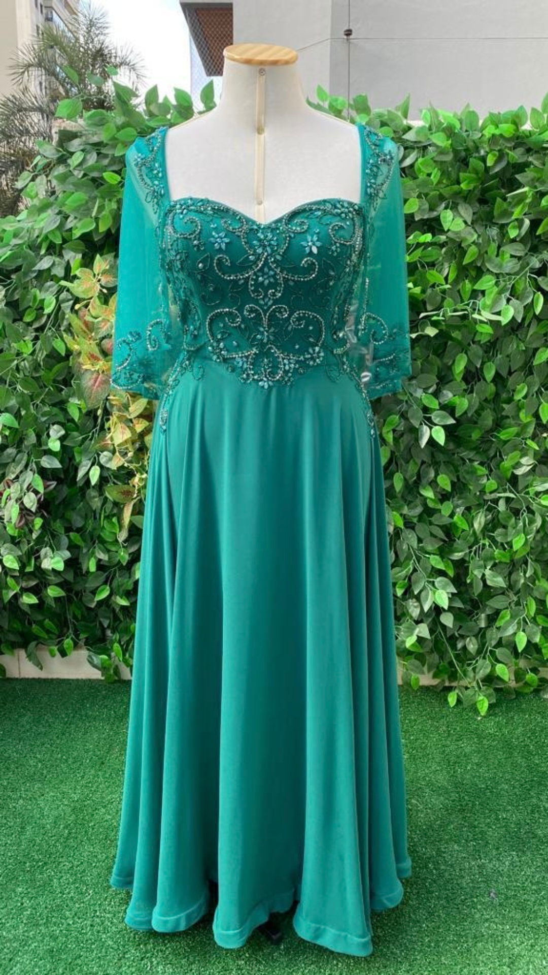 Vestido elegante longo, confeccionado em tecido fluido com excelente caimento. O busto apresenta aplicação detalhada de pedrarias e bordados em arabescos, enriquecendo o visual com sofisticação. O decote coração com transparência discreta nas mangas 3/4 em tule traz leveza e cobertura ideal para eventos formais. A modelagem levemente evasê valoriza diferentes silhuetas com conforto. Ideal para ocasiões especiais como casamentos e formaturas, especialmente para mulheres que desejam um look clássico e refinado.
